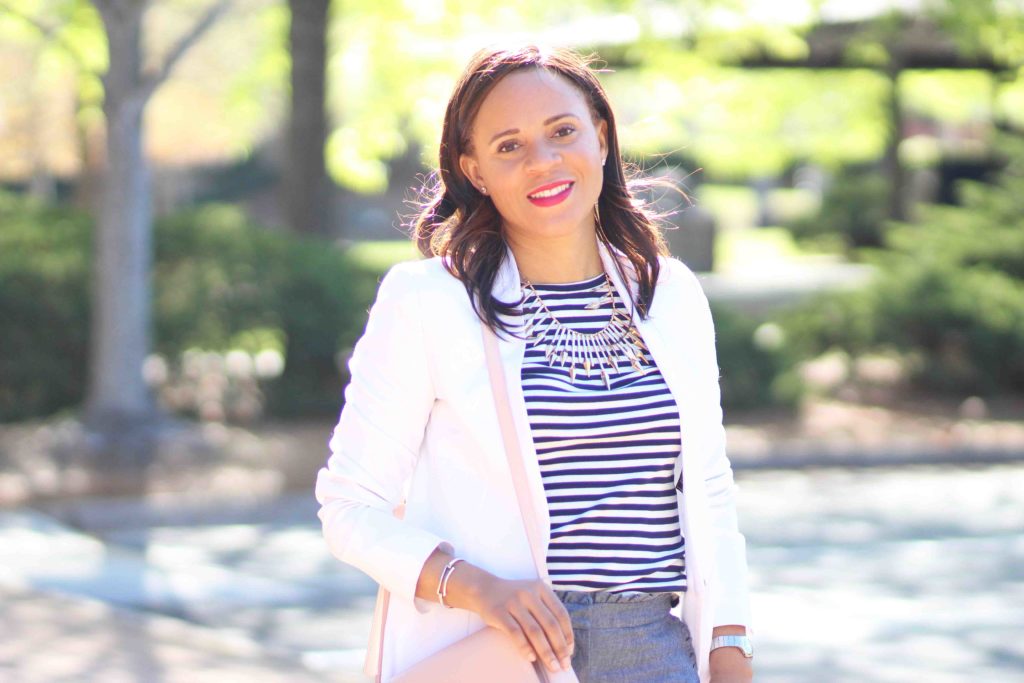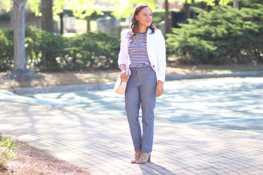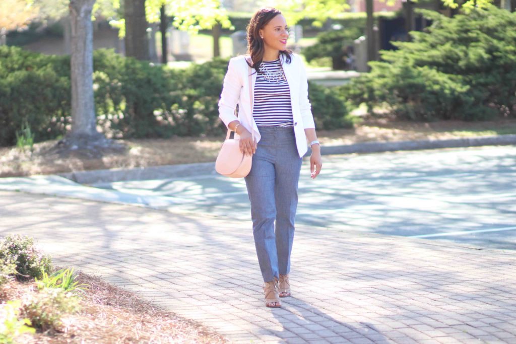 Jacket: Custom, similar / Top: J.Crew / Pants: J.Crew / Shoes: Sam Edelman (on sale!) / Bag: Old Navy / Necklace: Bauble Bar