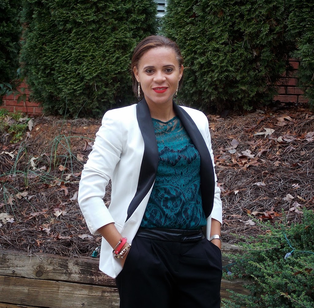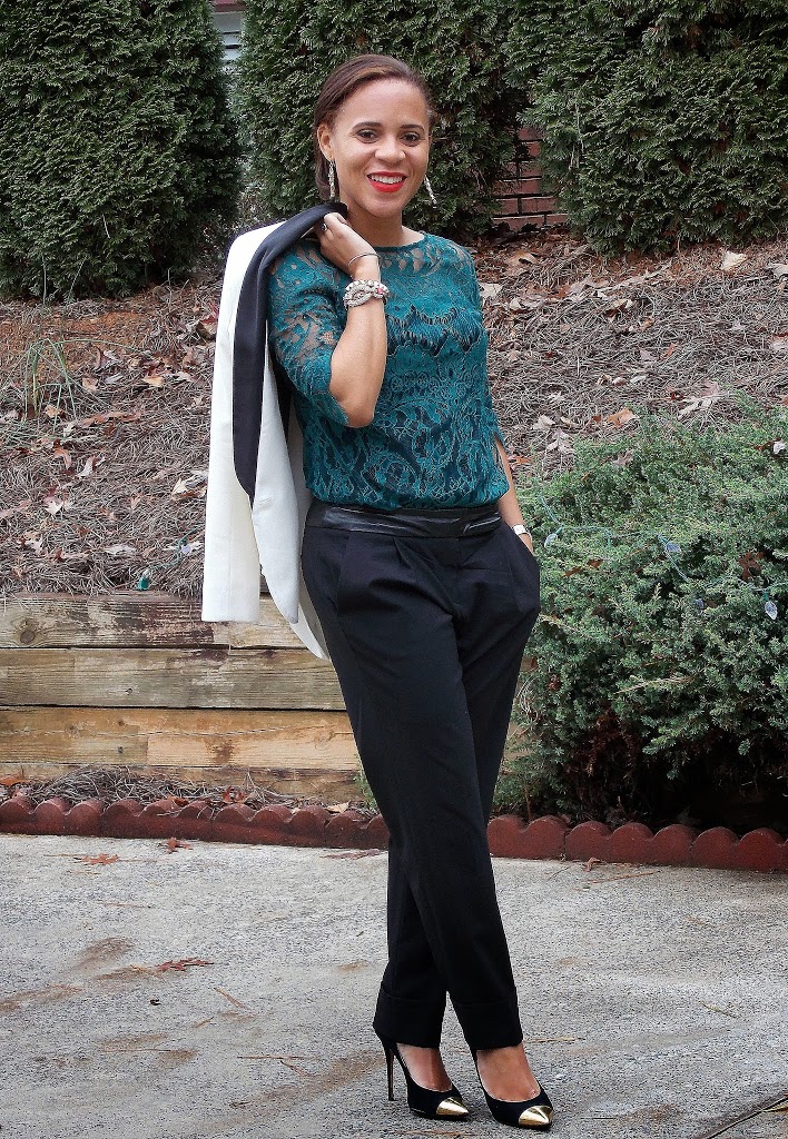 These pants were a Black Friday/Thursday score (50% off!!) and I love them.   You may recognize them from a past Wednesday wishlist (and maybe the shirt also…).  I’m obsessed with all things leather so the leather waistband is right up my alley and the slouchy fit is perfect against the feminine lace top.  Add some sparkly jewels, my tuxedo jacket and I was ready to go dance the night away with my co-workers!