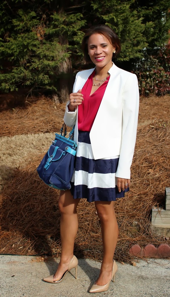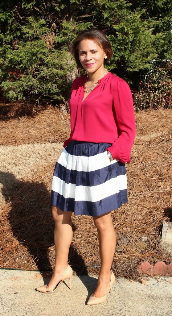 As we prep for snow, it is crazy to look back to the outfit I wore on Sunday when it was 60+ degrees! It felt like spring, so I decided to dress like it was spring. I’m so over winter!! When I first bought this skirt, I couldn’t decide what to wear with it and I got stuck in a white t-shirt rut. With Valentine’s Day coming up, I decided to try to pair it with one of my favorite tops that I don’t wear enough, and I realized I love the combo! Don’t you love it when that happens?! I’m also pretty excited about these shoes. I bought them after Thanksgiving and finally got the chance to wear them. They were the best deal, marked down from $128 to $32! They are a half size too small, but at that price I’m making them work. I always look at sale shoes around my size since you never know how they will run or if they will work.