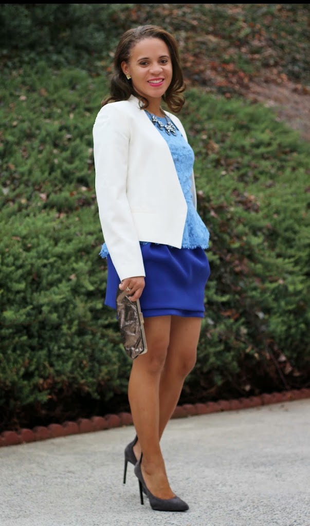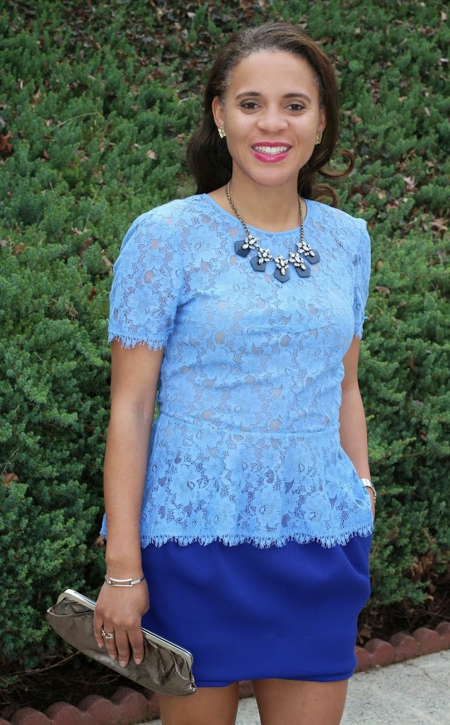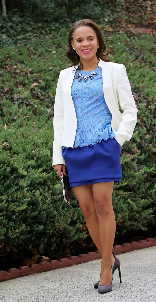 Blue is growing on me as I’ve always been more of a pink person, but I loved the lace and peplum of this top and the beautiful color of this skirt. The different textures break up the color nicely. I paired them with my favorite pumps (I didn’t show the back detail, but it is my favorite part of these shoes!) and my new favorite Bauble Bar necklace, which I get so many compliments on! I added a jacket to make it slightly more work appropriate (my office is very casual and very fashion-forward) and if I got cold during the day (which always happens!). I can’t wait for it to get warmer to wear this outfit without the jacket.