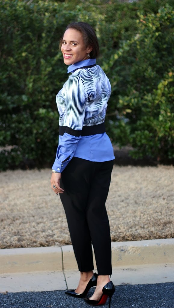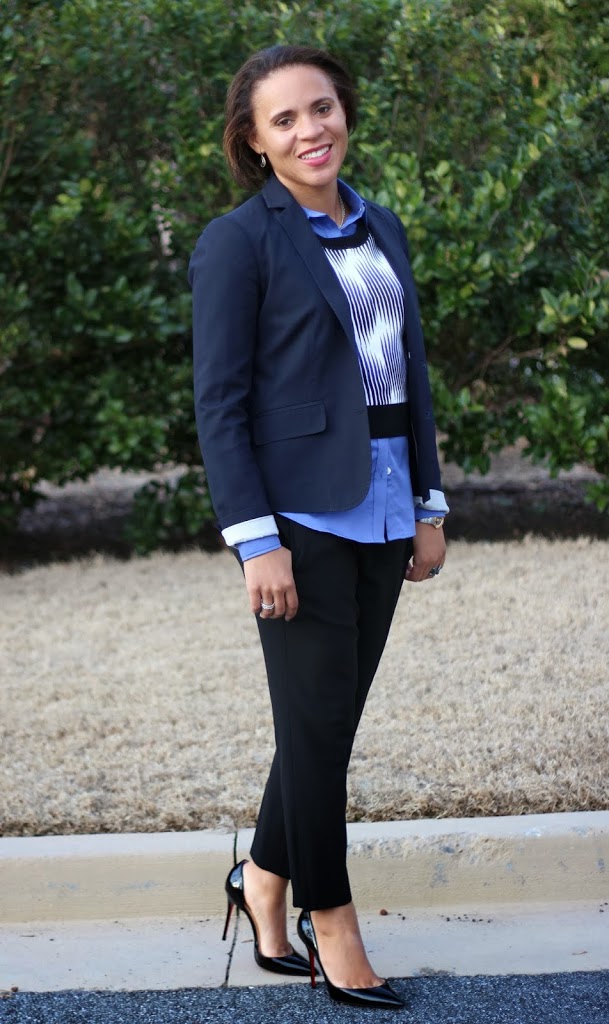 On Friday, I mentioned my love of the Target collaborations and am pretty excited about this top, the other piece I bought from the Peter Pilotto collection.  I’m so proud of myself for only buying 2 pieces!  When I picked up this crop top, I wasn’t sure about it, but figured I could return it if I didn’t like it.  Surprisingly, it is very easy to style.  I wanted to be able to wear it to work, and I love it over this blue oxford, which has been sitting in my closet for months waiting to be worn.  I guess I was really feeling the blue theme since I added a blue blazer.  The blue is a nice departure from my black and white combos.