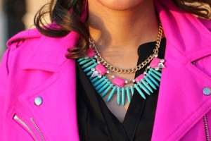 that pink moto jacket is just fabulous!! Looks amazing on you, especially when paired with that cute and colorful necklace.