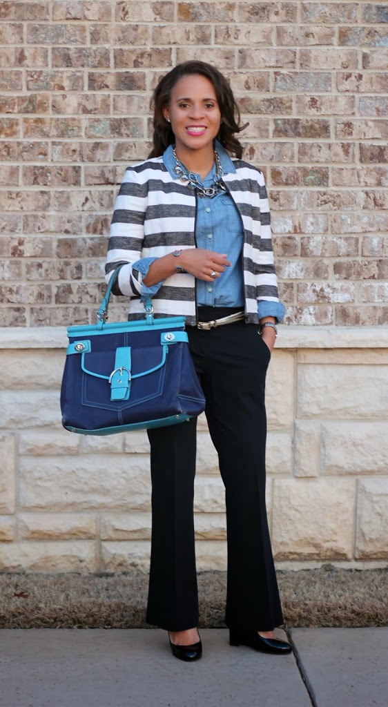 For me, most clothes have to serve a dual purpose (work and play) for me to justify them.  This shirt is surprisingly easy to style as I treat just like any other blue shirt.  I made it work appropriate by pairing with my new blazer from Loft and black pants (and of course, some state necklaces!).  I’ve already also worn it casually with black denim and can’t wait to find more ways to wear it.  I should have bought one of these so much sooner!!