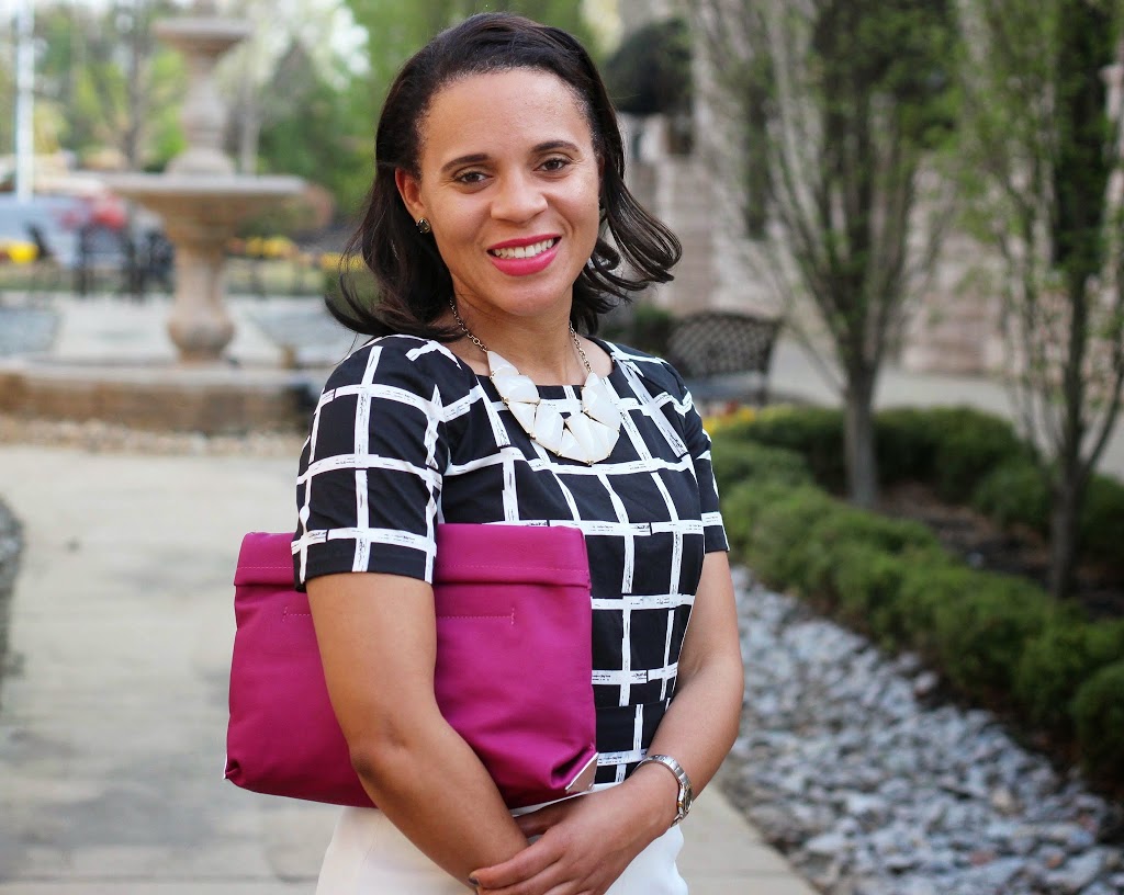 What a gorgeous dress that is Nicole. WOW! I love it. I am wearing the same colors today: Cobalt, Black & White. Loving the addition of your Magenta Clutch too.