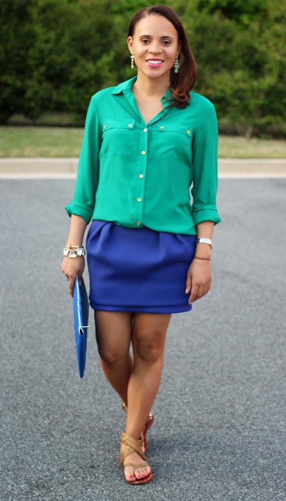 I hope your week is going well!  I bought this skirt a while ago during the Bloomies end of season sale and have been waiting patiently to wear it.  I’m so glad the warm weather is here and I can finally wear it!  I love the color and would normally pair it with a white t-shirt for a more casual look, but decided to dress it up with this silk shirt.  I can see why everyone is going crazy for those Equipment silk shirts!  This blouse is so versatile, a great color and a perfect way to add polish to a look.  And did I mention it is machine washable?  Perfect!
