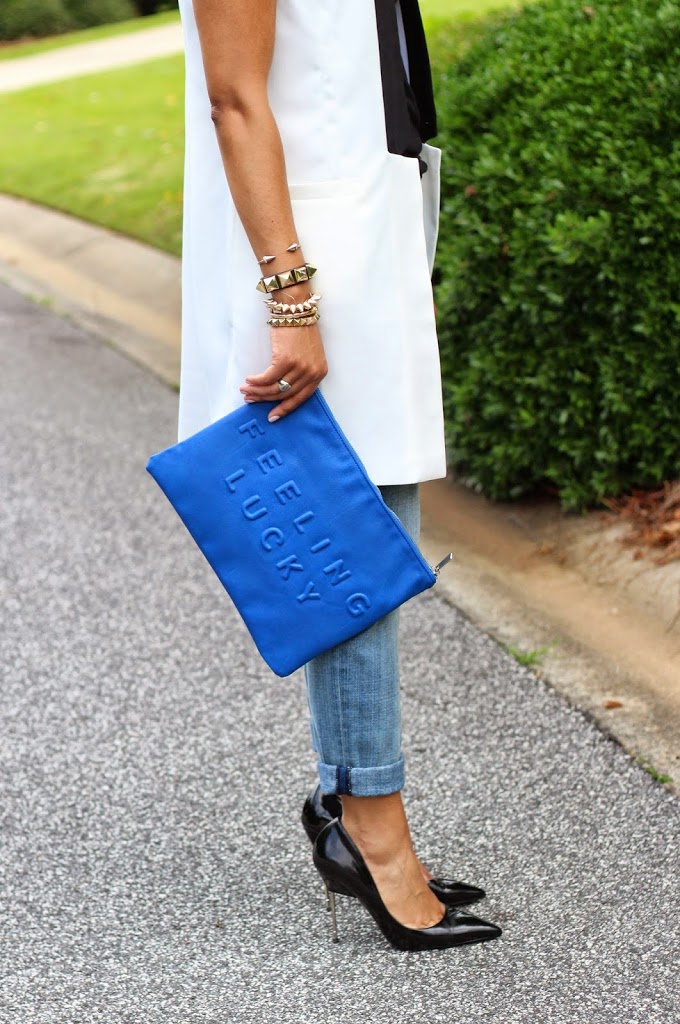 Love that dress as a vest! The proportions are perfect with the rolled jeans, big blue clutch, and arm party.