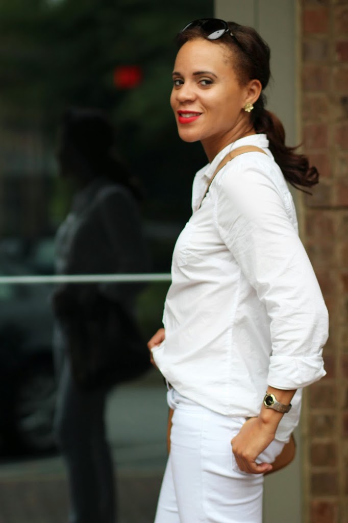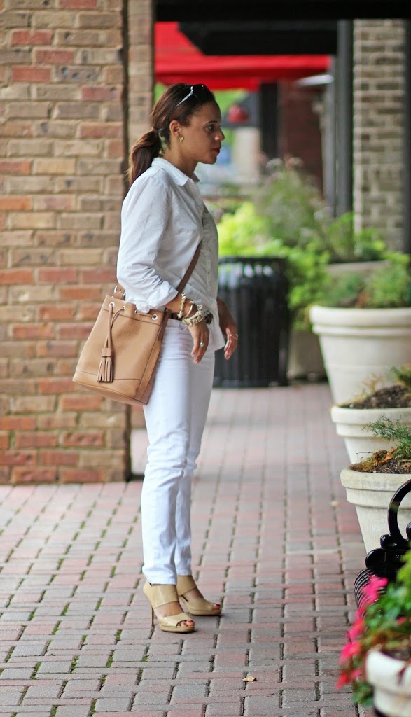 Such a chic, classic look! Love the all white with the neutral accessories!