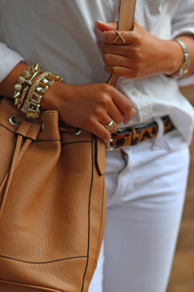 I bought this white shirt from Target in the beginning of the summer and it has become my go-to casual white shirt. I paired it with my favorite (only) pair of white jeans and added a few pops of brown and my trusty leopard belt to add a little visual interest to this outfit. I know you guys are probably sick of seeing this bag, but I can’t help how much I love it. It goes with everything and I don’t feel like I have to worry about it quite as much as I would with a more expensive bag.