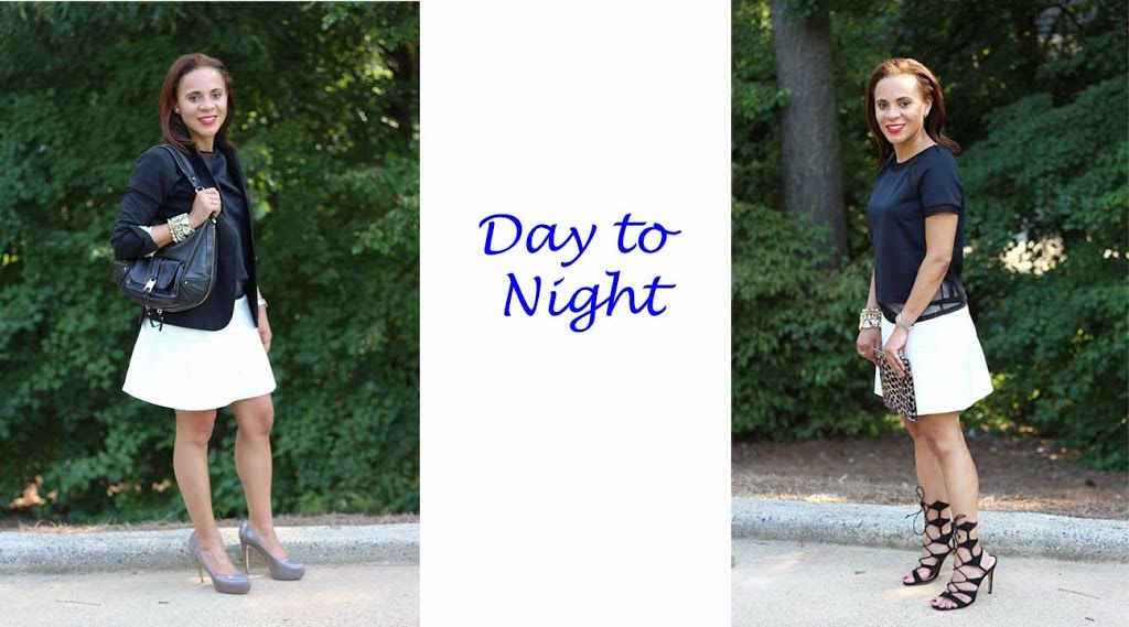 We must be on the same wave length today because my post today is Day to Night as well!! LOVE those gray pumps and your Marc Jacobs purse for day! And of course your leopard clutch and strappy heels are the perfect addition for evening!