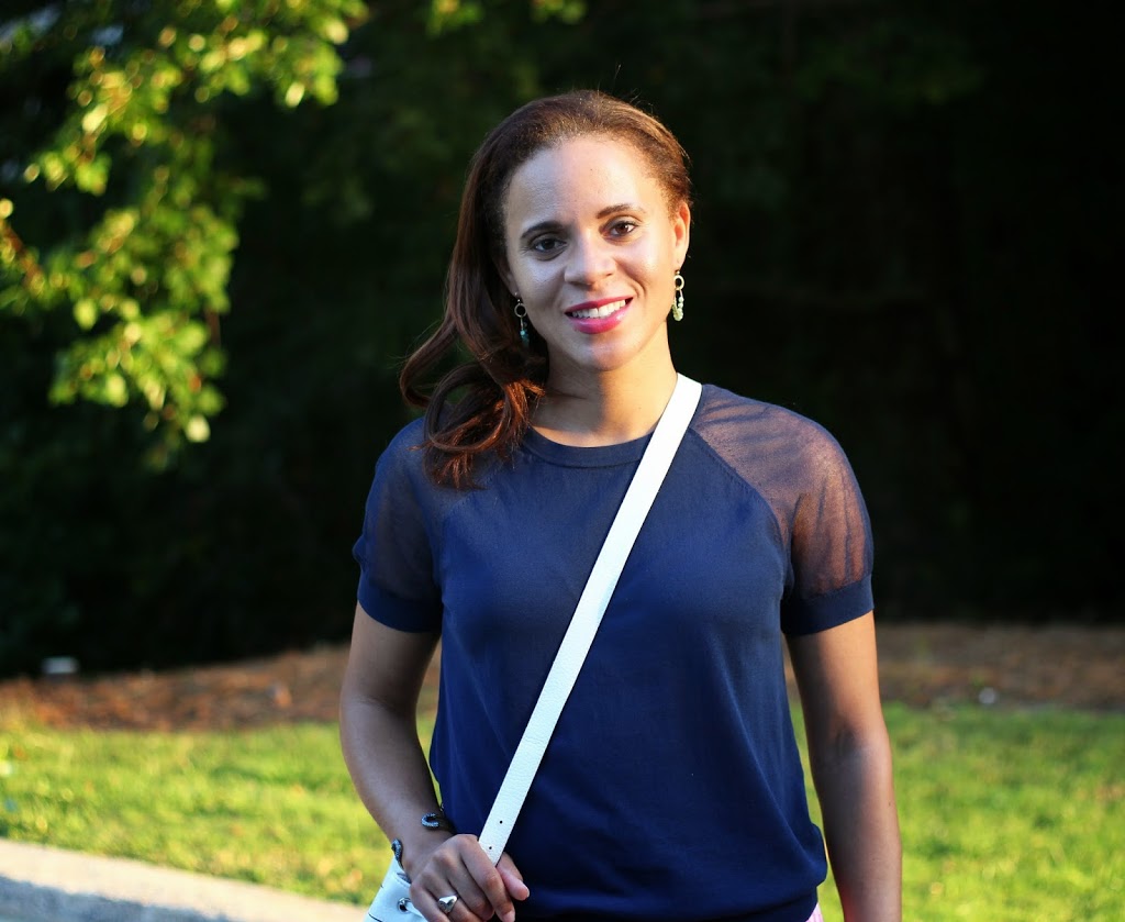 What a fabulous combo: pink and navy blue! You look terrific. I especially like the shirt… :)