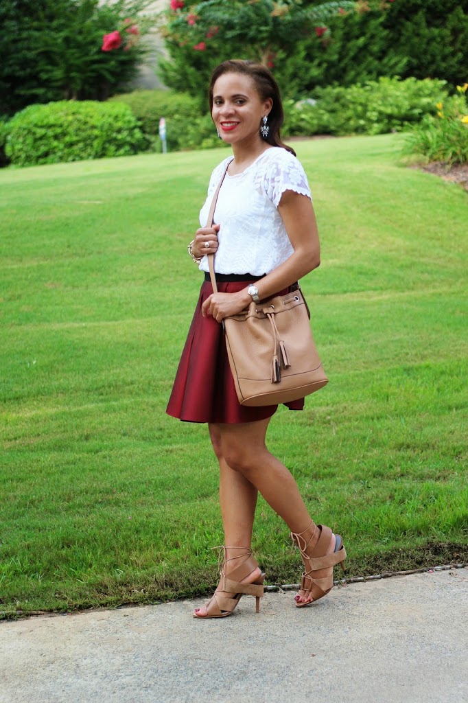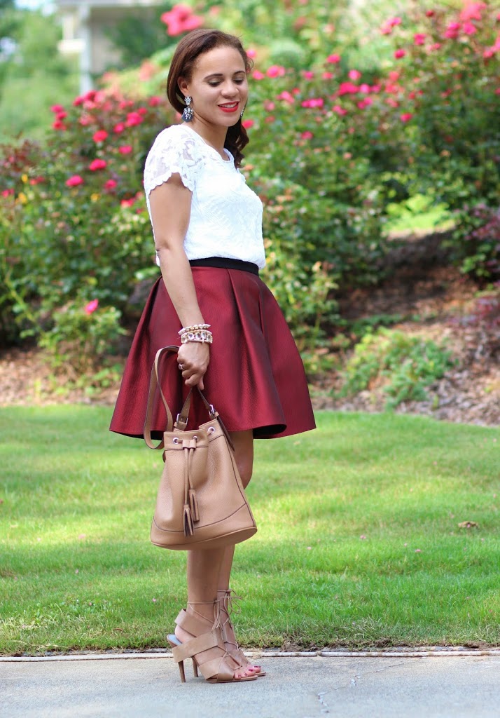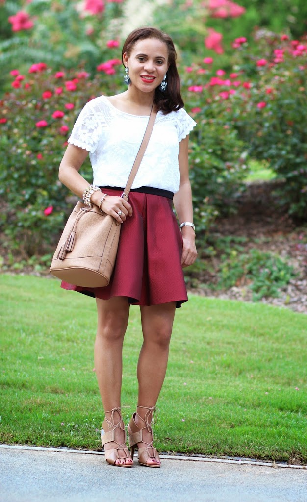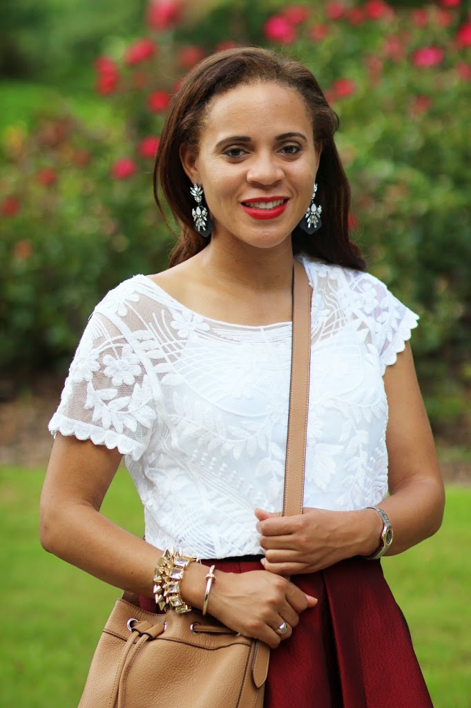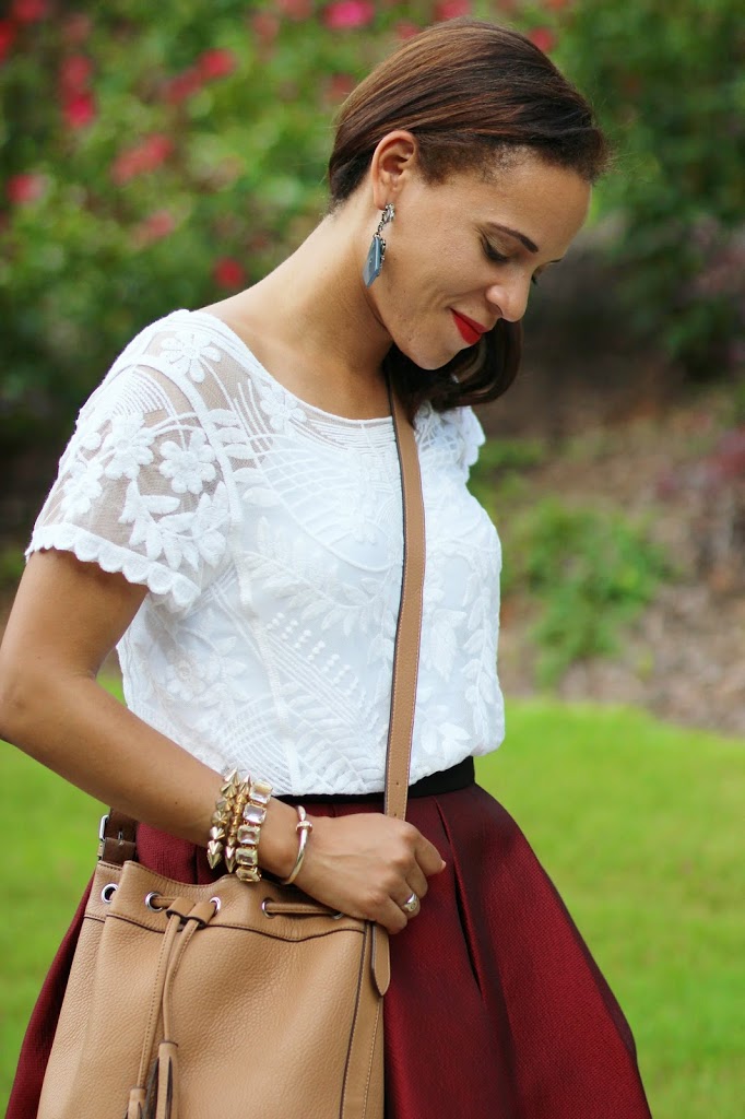 Nicole, this is a stunning look! As soon as i saw your top, I had to look it up. I love the sheerness and the lace detailing. THis burgundy skirt is so rich looking, will also be great in the fall. You look fab!!