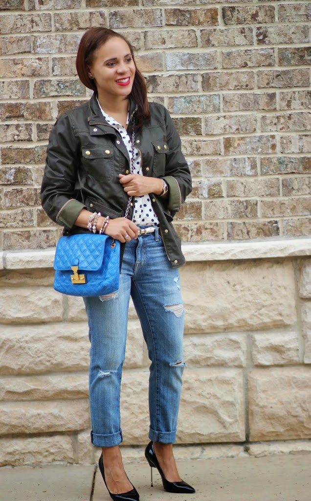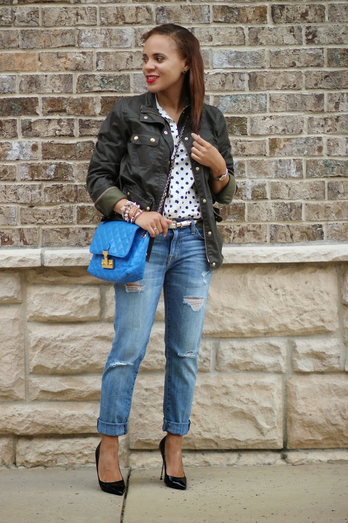 I love the way you made polka dots edgy with those fabulous distressed boyfriend jeans and that jacket. Great weekend look!