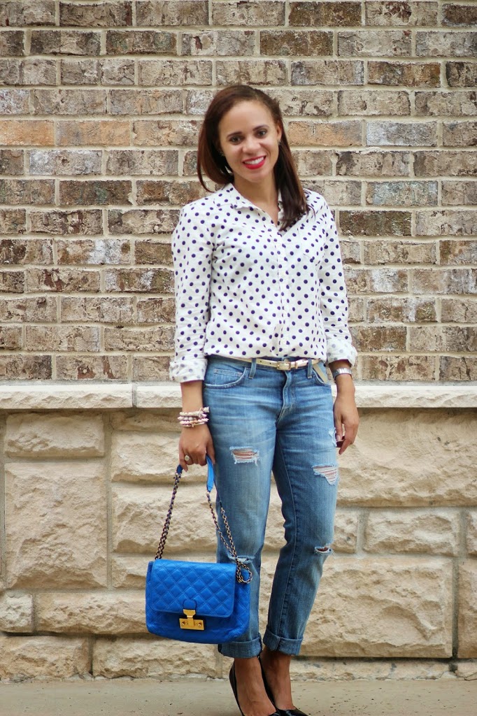 Love the polka dots and boyfriend jeans! The pop of blue is the perfect touch! Such a cute casual look!