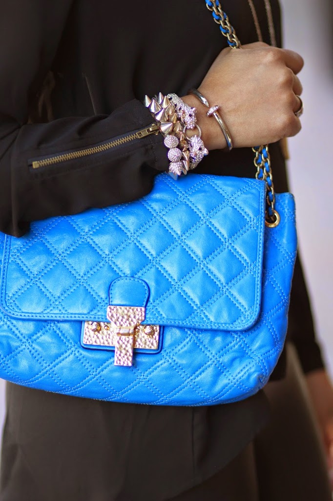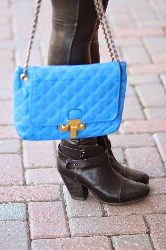 I love all the black with the leather and texture detailing. As always, your pop of blue in the bag is always perfect!