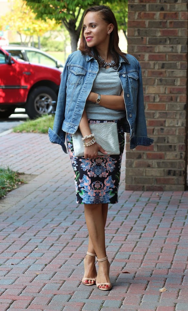 Love how you styled that gorgeous mirror floral pencil skirt. Looks great with the gray tee and light-wash denim jacket. =)