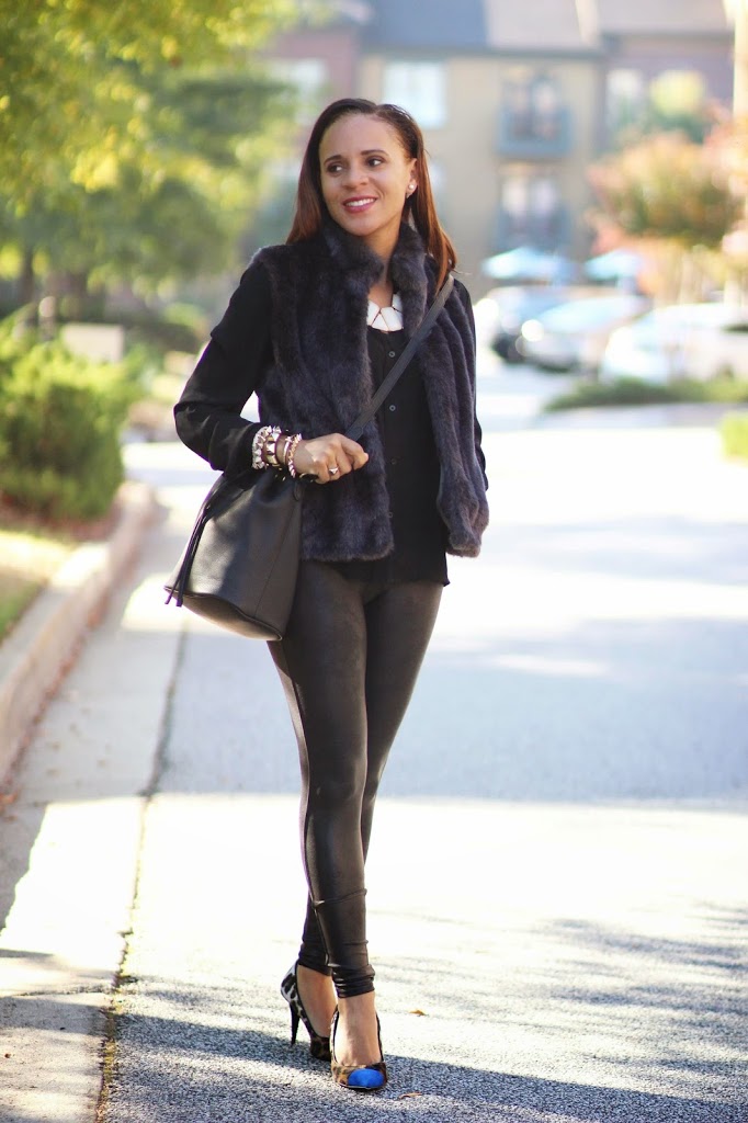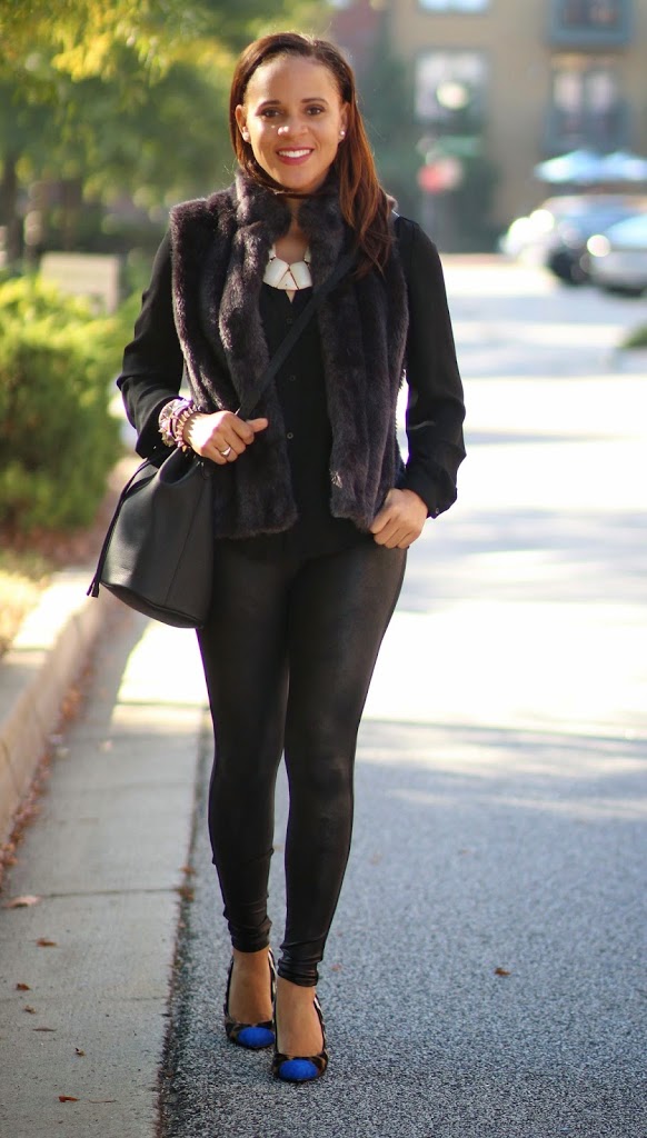 Love the leggings the blue pop in the shoes and I am a fan of this dark brown color with the fur vests! You look great