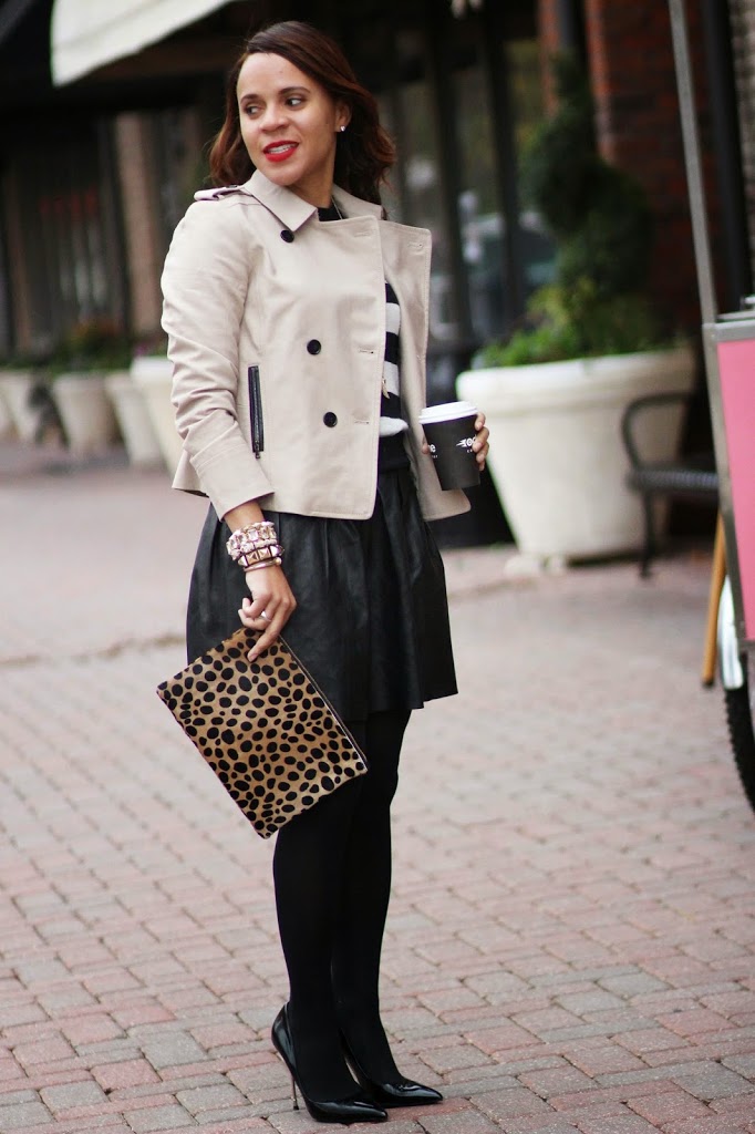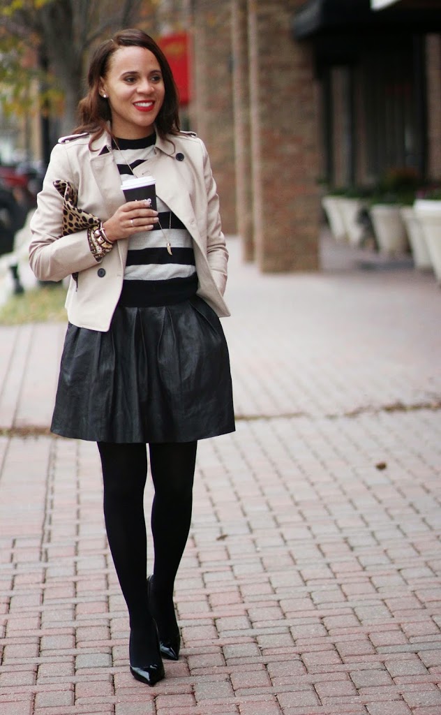 Now, onto the clothes. Living in Atlanta, I’m pretty lucky that I can wear most of my wardrobe year-round. When the temperatures dipped (or dipped for Atlanta), I immediately reached for my tights and favorite stripe sweater to winterize my favorite leather skirt. You know I’m cold when I have tights on! With the addition of a little leopard, this variation of my fail-proof black and white combo is ready for work (and after work without the jacket).