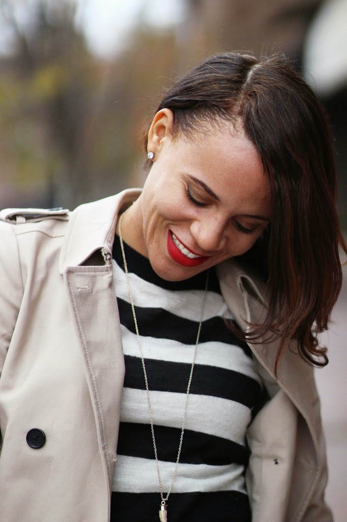 Well hello there sophisticate! You can’t go wrong with a classic khaki trench, a circle skirt and B+W stripes!!
