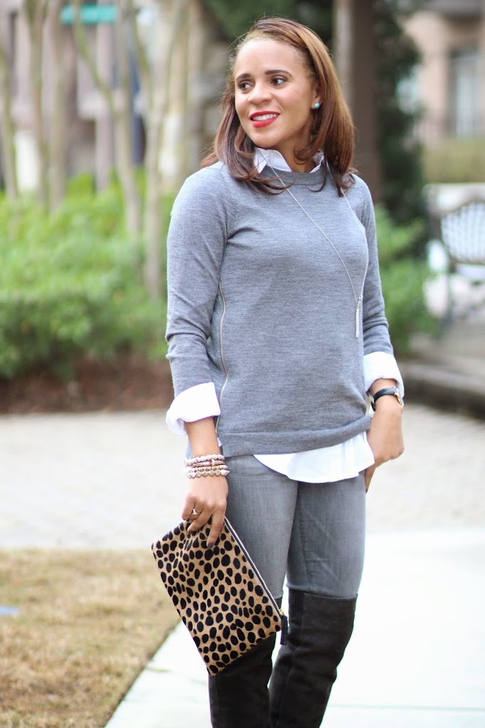 We all know how much I love black and white, but I decided to switch things up a bit and pair grey and white together for a change.  Grey has been such a big color for fall/winter, but it will transition perfectly into spring also (especially the lighter shades).  I’m looking forward to pairing this grey sweater with pink when it gets warmer.