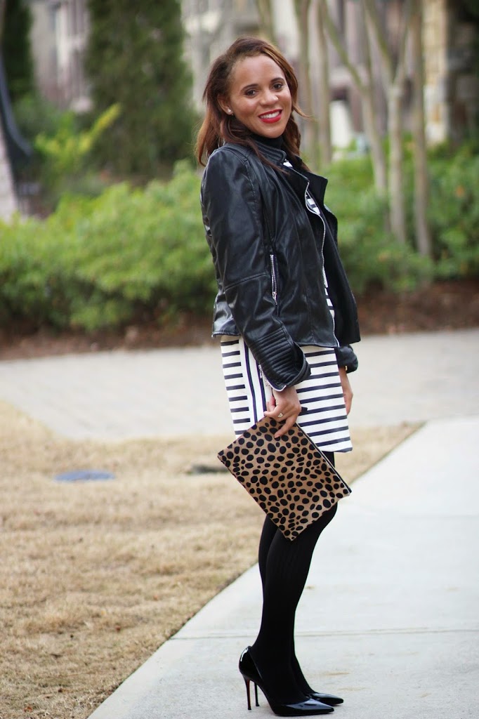 What a pretty stripe dress, I love it paired with the leather jacket.