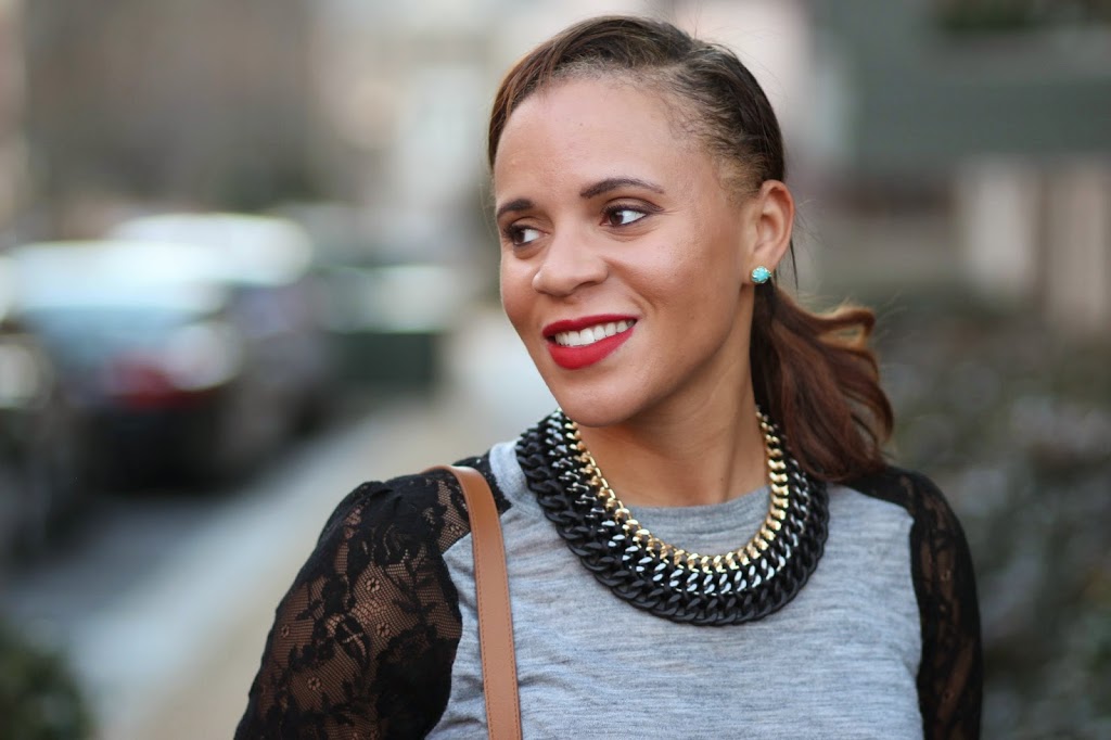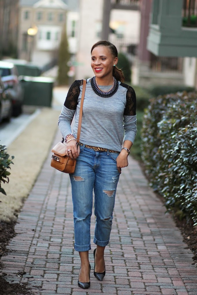 I love the hint of leopard on your belt and all of your accessories are so spot on! That shirt is calling my name, grey is one of my favorite colors and lace is always a feminine addition.