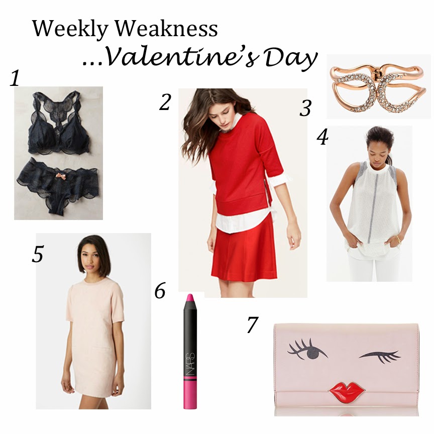 I hope your week is going well! I’m not a huge Valentine’s Day person (though I do love all of the chocolate…). I’m never one to pass up an opportunity to treat myself and grab a low key dinner with friends though. I’ve got my eye on another color of my favorite lip pencil, this beautiful lingerie set (even if I’m the only one seeing it!) and how fun is this cheeky clutch?