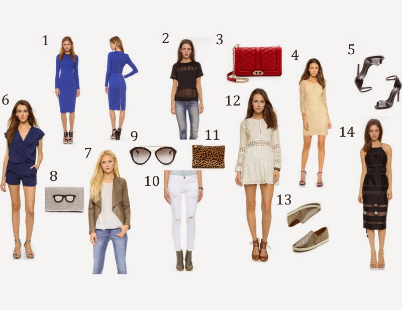 1 –5th and Mercer Dress (skirt version here)/ 2 –Generation Love Top /3 – Rebecca Minkoff Bag /4 – DVF Dress /5 – Schutz Sandals / 6 – Emerson Thorpe Romper /7 – BB Dakota Jacket (such a great deal!) /8 – Koku clutch /9 – Prada Sunglasses /10 – Current/Elliott Jeans /11 – Clare V clutch /12 – Raga Dress (under $120) /13 – Joie Sneakers /14 – Milly dress