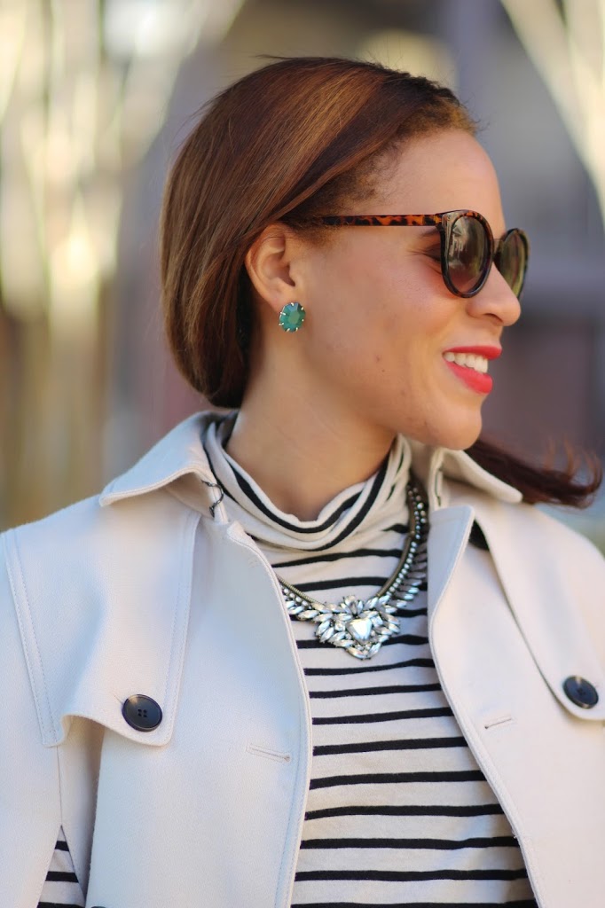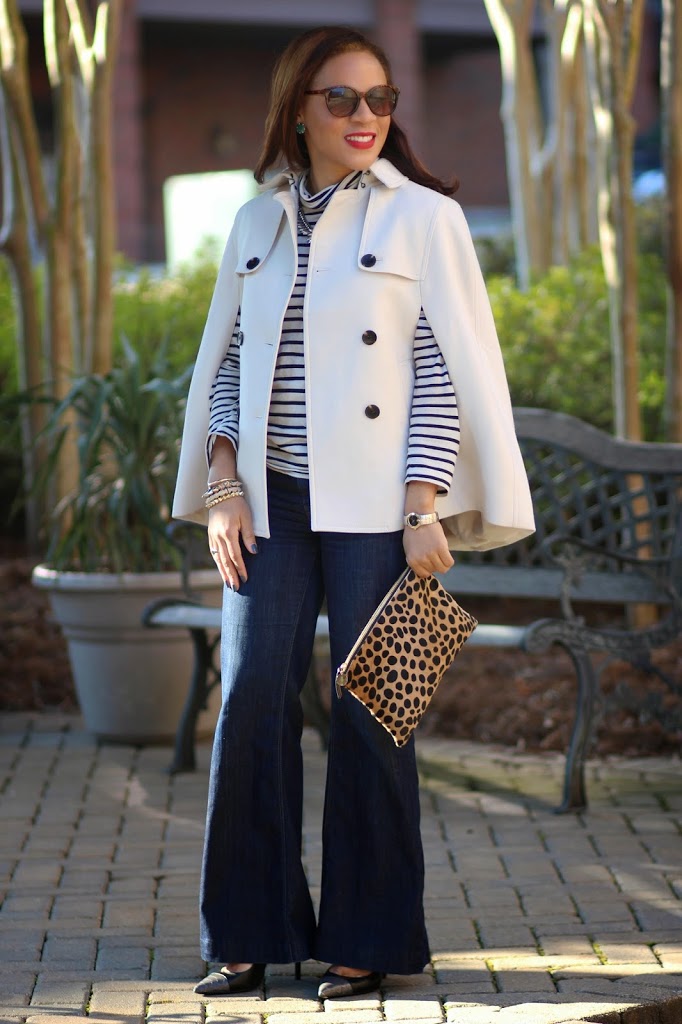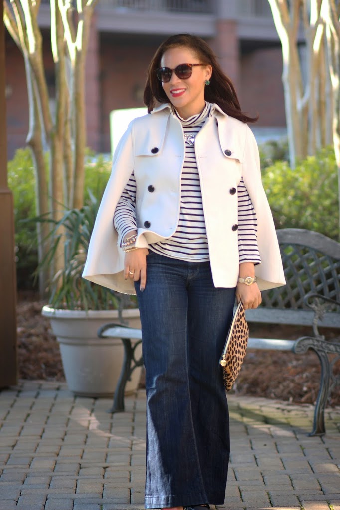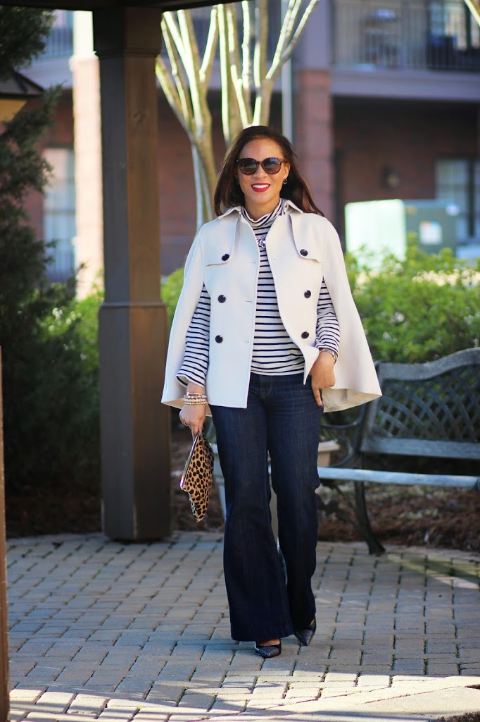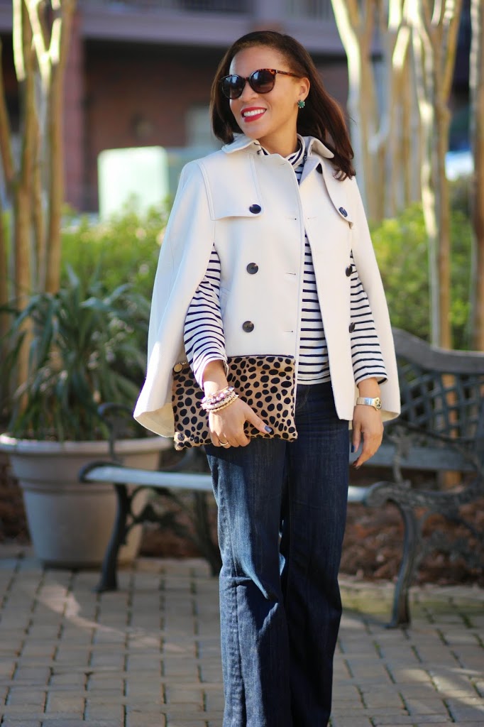 I hope your week is going well!  As soon as I saw this Ann Taylor trench cape I knew I had to have it (or at least wait for a sale to pick it up).  It is the perfect transitional piece and satisfies my craving for a camel coat which I can’t justify this late in the season.  Of course I had to add my favorite Clare V. leopard clutch and stripe turtleneck.  Something old, something new.