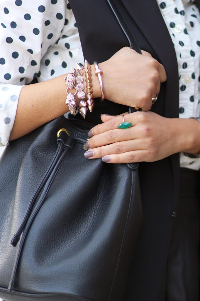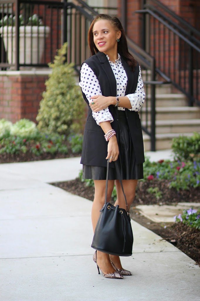 What a chic look – I really love the polka dots + leather skirt – a great mix of edgy and feminine :) Always my favorite types of styles!