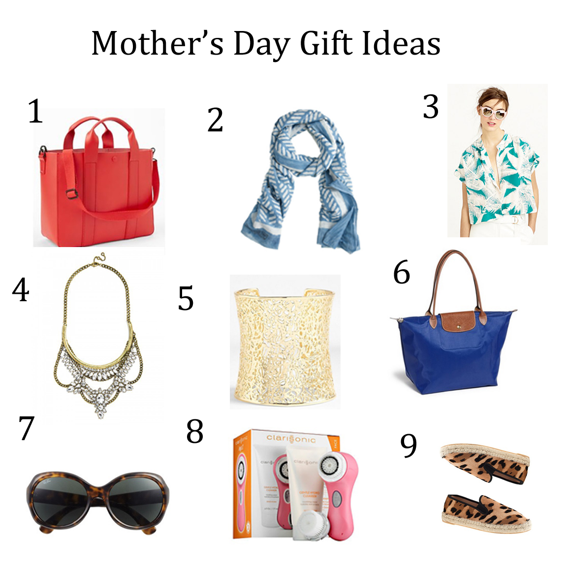 I’m normally so last minute with everything, but I’m trying stop that habit.  Mother’s Day is in 2 weeks (where is the year going?!) so I’ve started pulling together a couple of Mother’s Day gift ideas.  My mom is one of the most important people in my life and I feel so fortunate to count her as one my best friends.  Since I normally in charge of organizing the gifts from the family for mom, I figured I should get a head start at trying to figure out what she might want.  She almost always wears black so I stopped trying to introduce color years ago….  She loves her accessories (I guess that is where I get it) so statement necklaces, a great bag, and sunglasses are all high on my list for her since they are things she wouldn’t normally buy for herself.