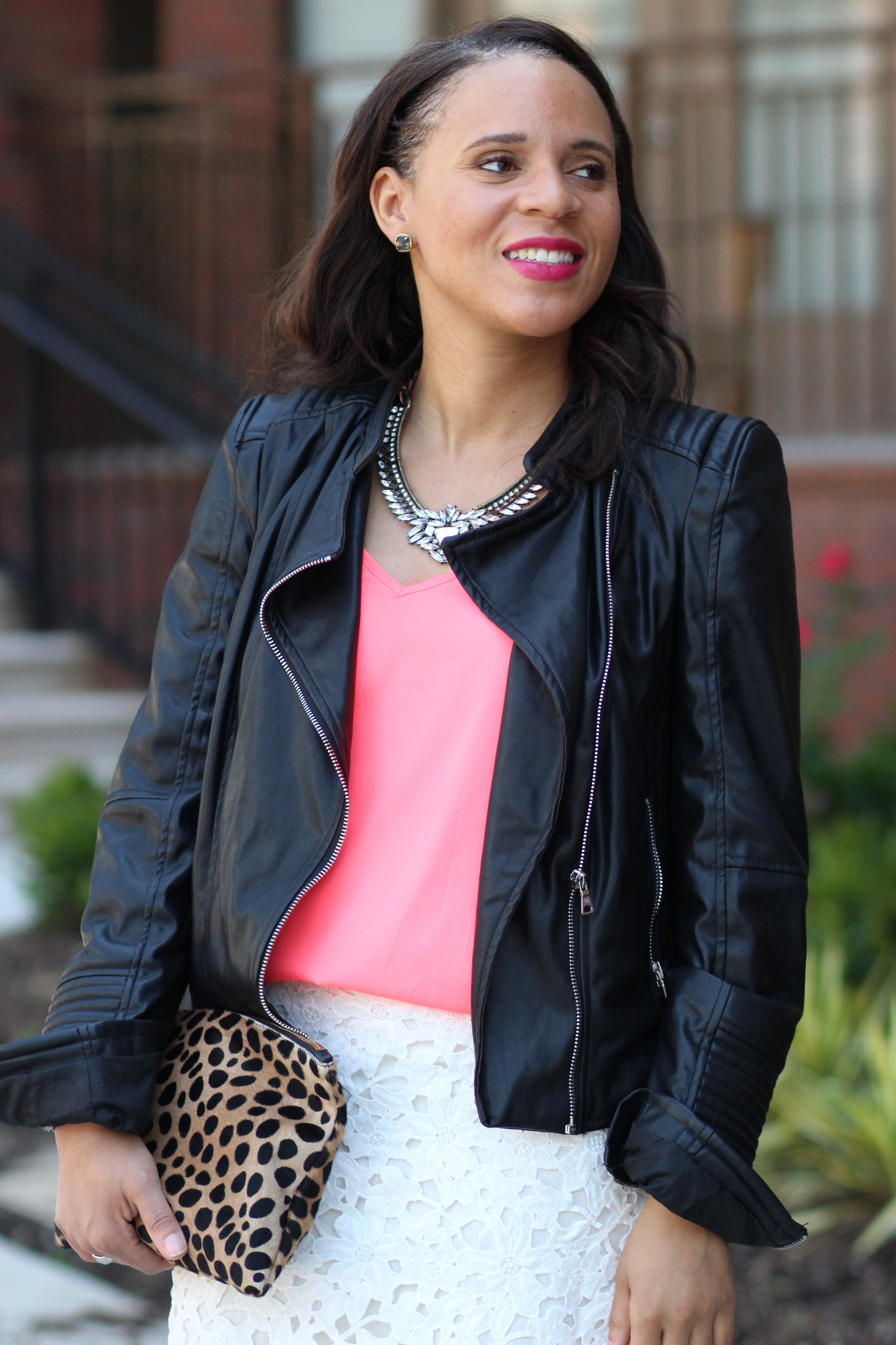 I have this skirt too and I also have in the dress version from last year. I just adore the lace pattern. It looks great with the leopard and moto jacket.