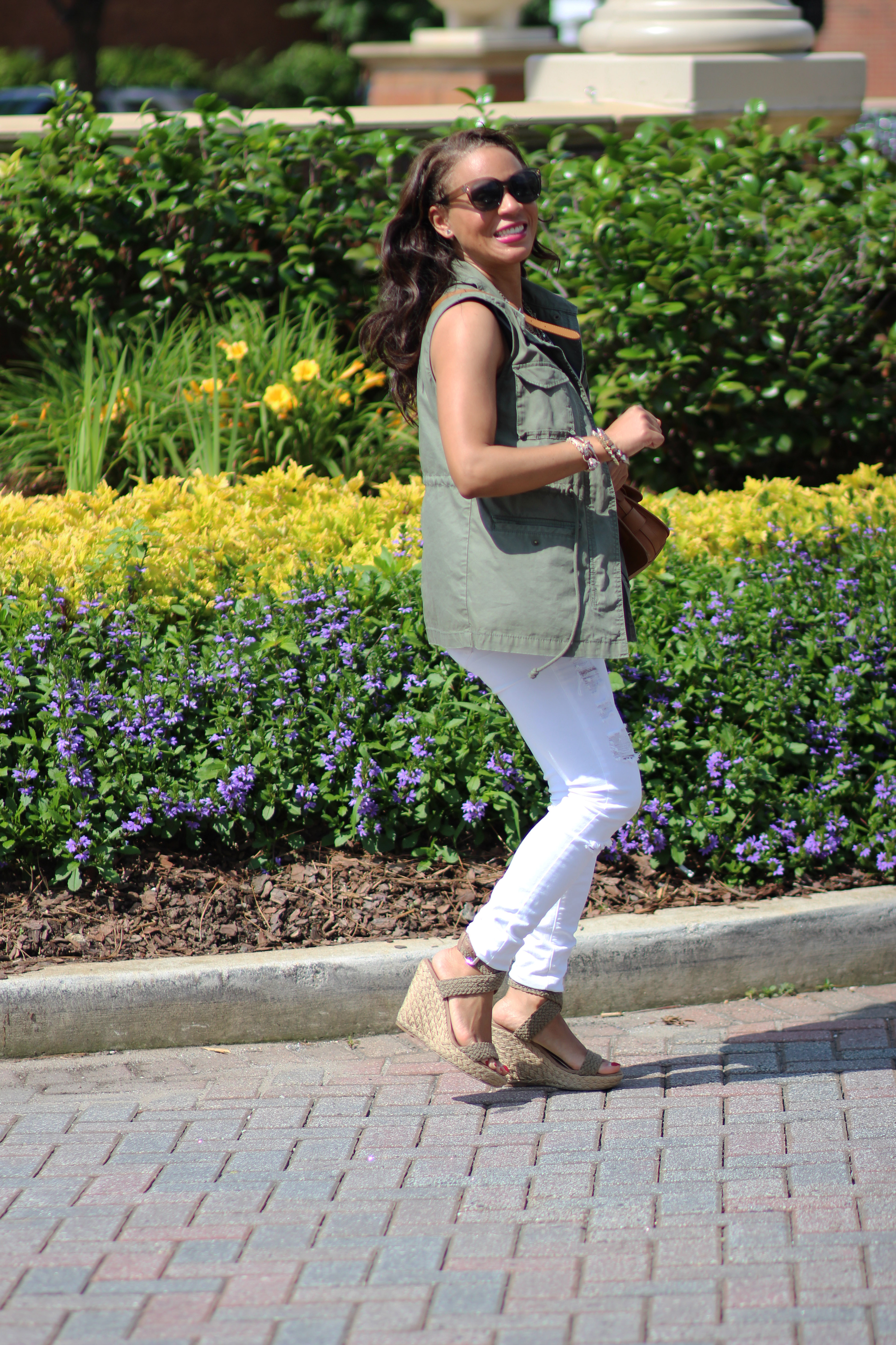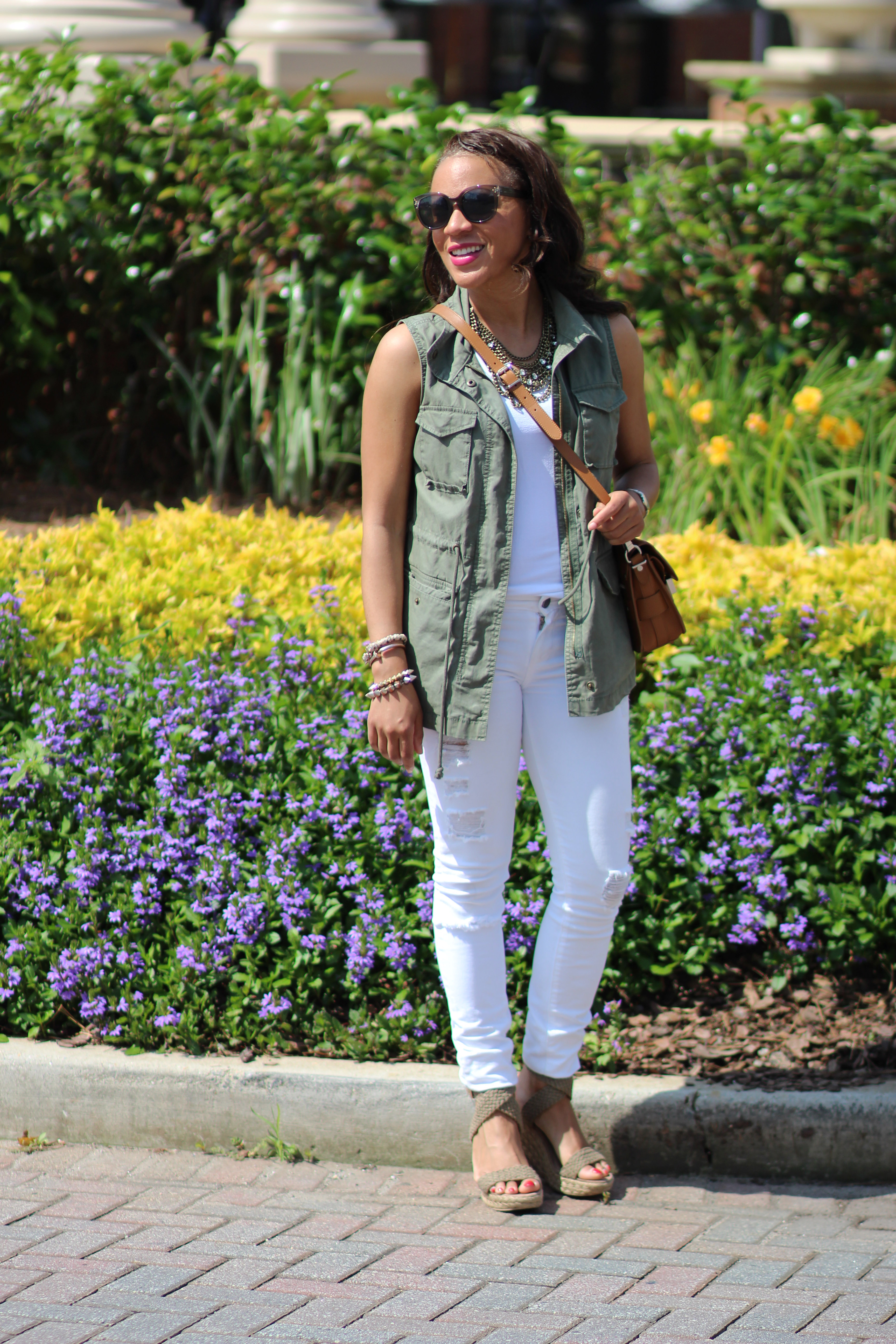 I really love that vest with the distressed denim! Olive and anything look great together but I really love it paired with white most! Great necklace too!