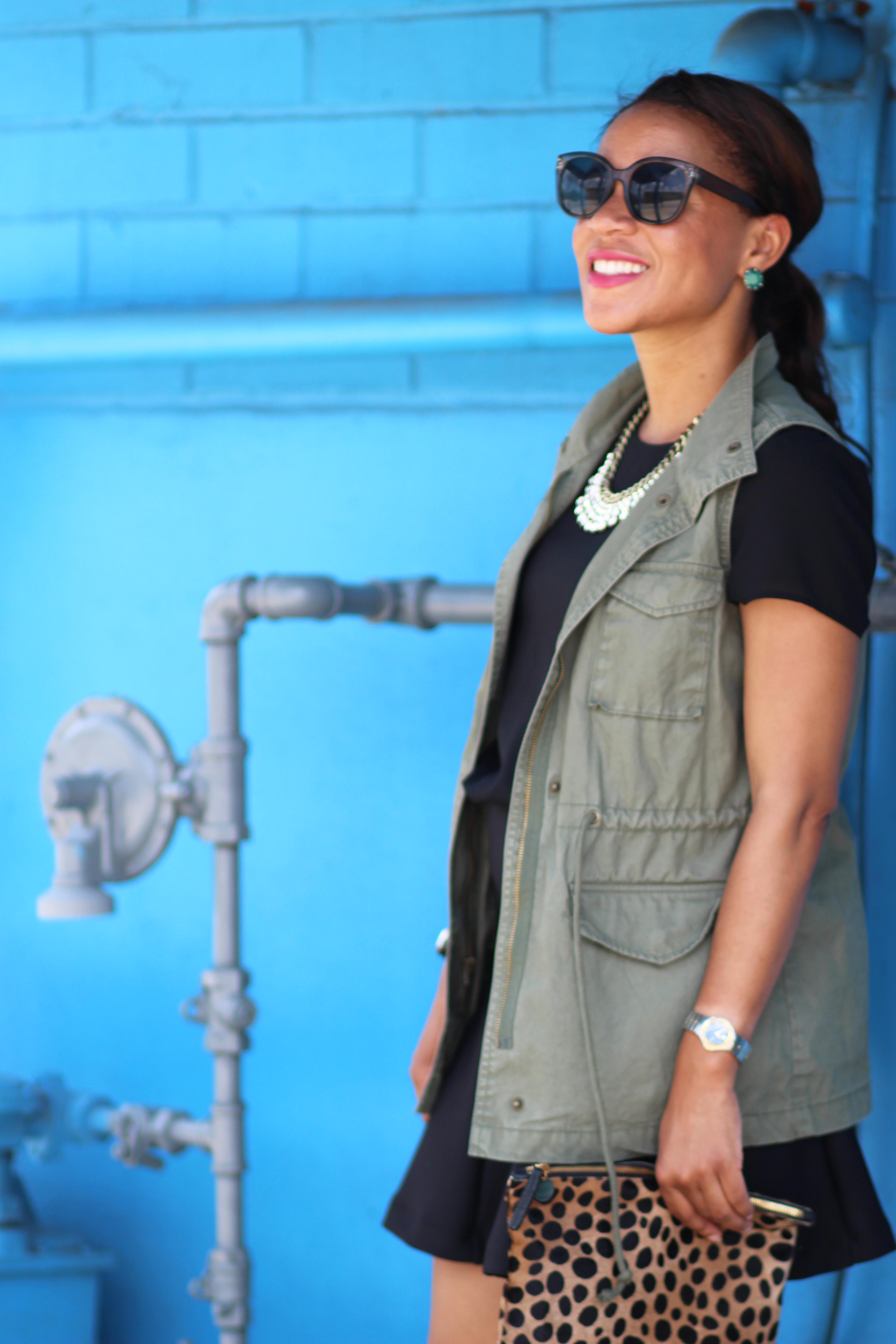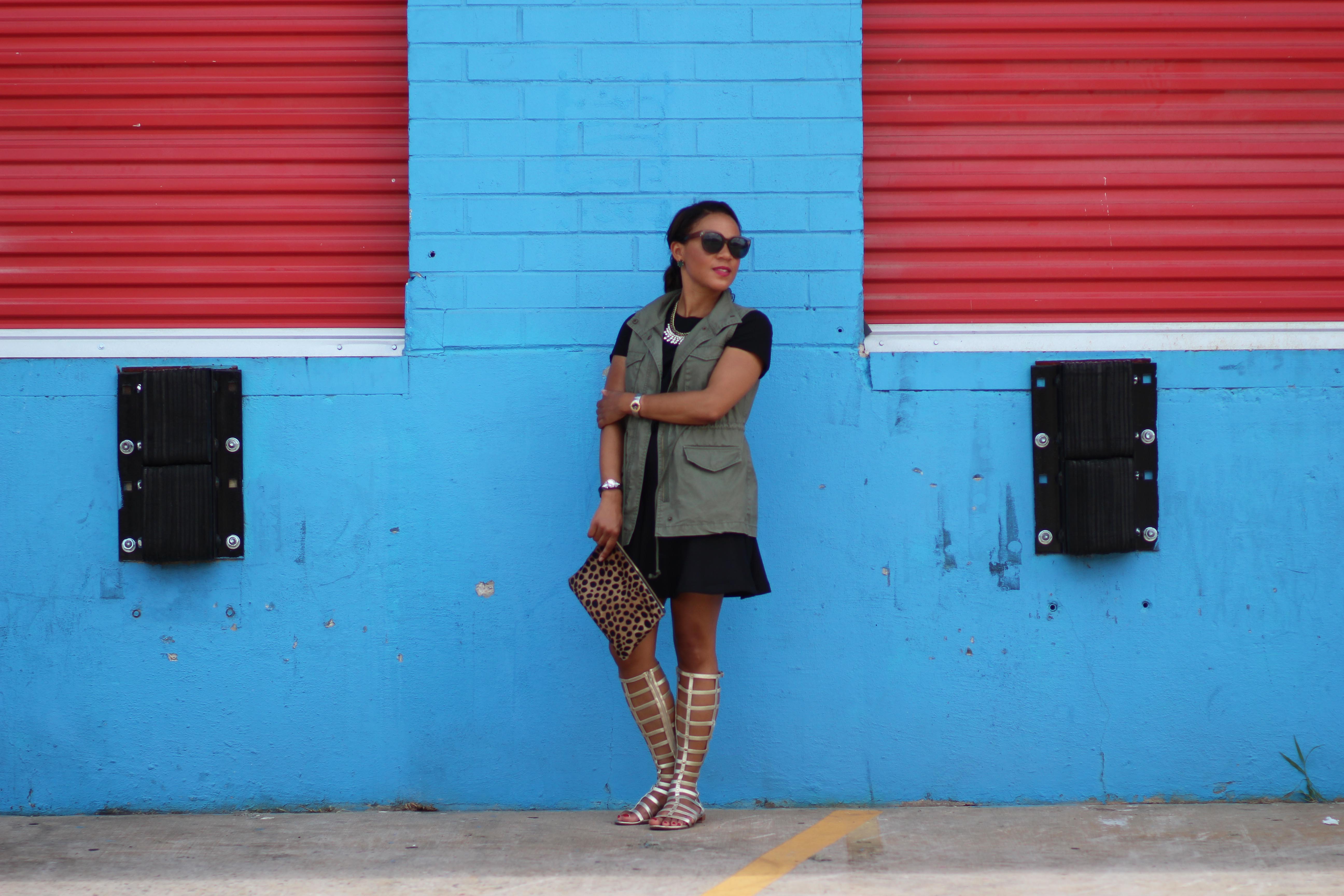 love the way you styled this!!! from the gladiator sandals, to the leopard clutch and military vest! awesome!