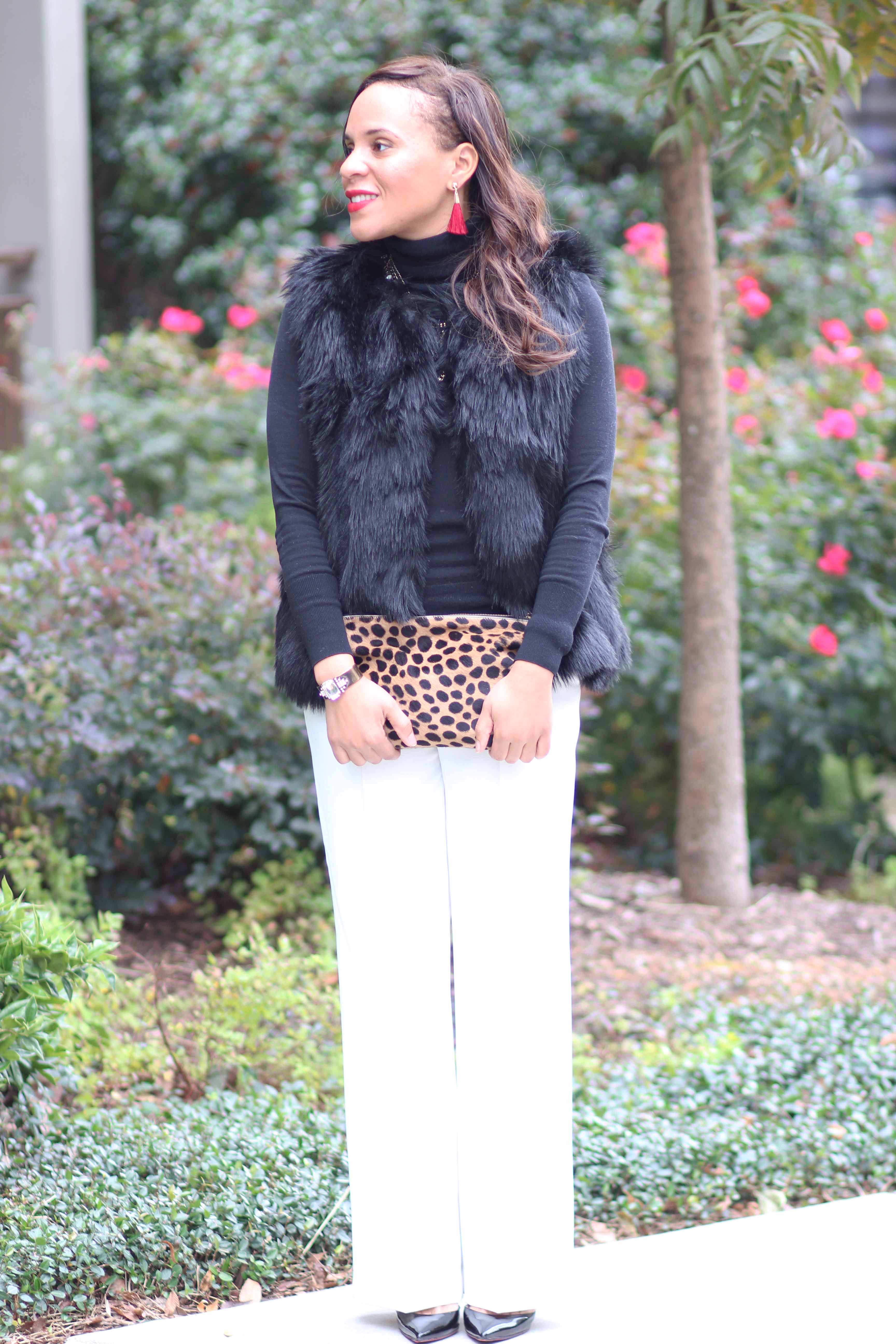 For days when I have to go straight from work to an after work holiday party, I will always rely on my accessories to take me from work to play. This black and white outfit is a very simple work outfit and goes into holiday party mode with the addition of this Topshop faux fur vest, Baublebar jewelry, and my favorite Clare V. leopard clutch. These Baublebar tassel earrings are the perfect addition to any holiday outfit (the color is perfect!).