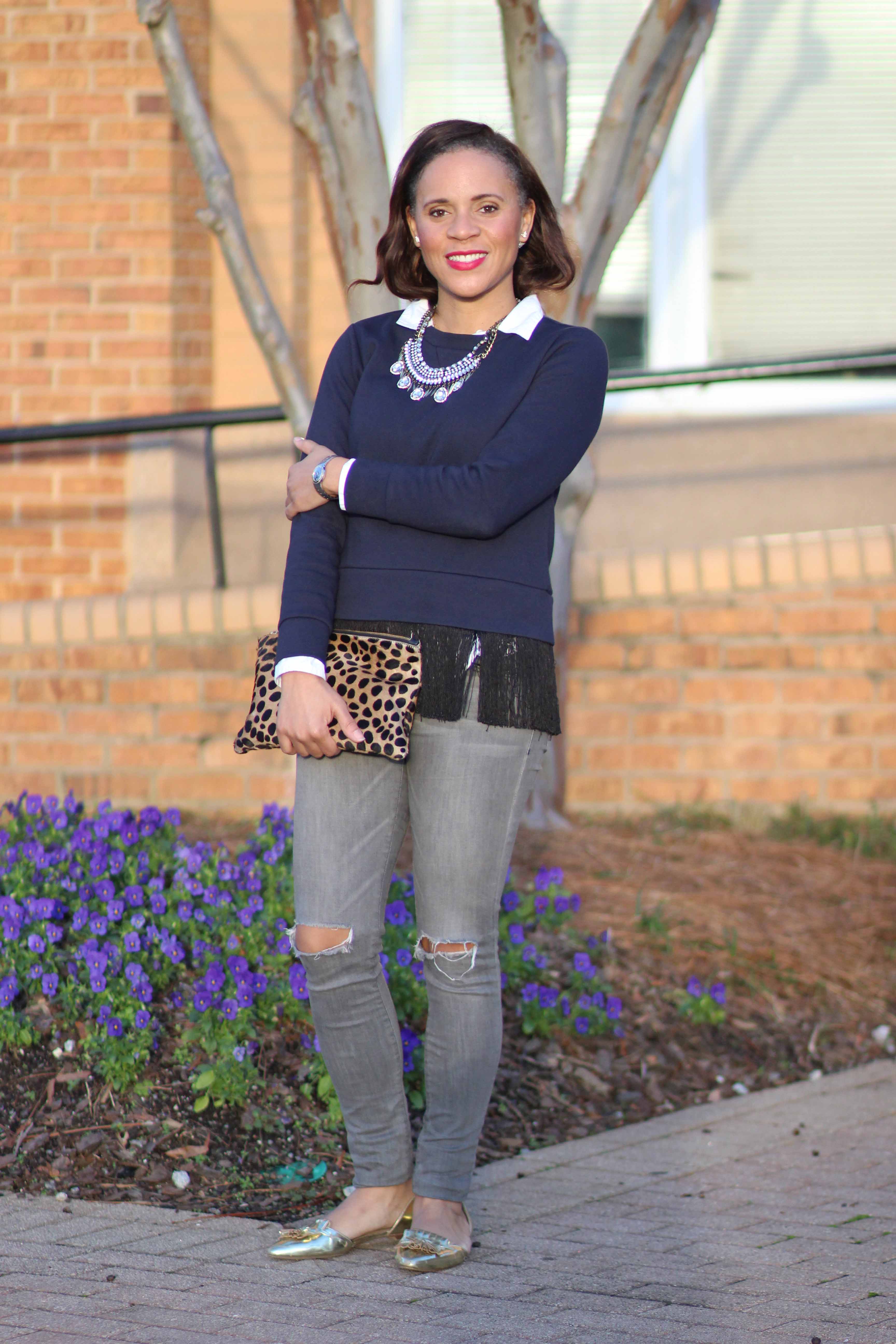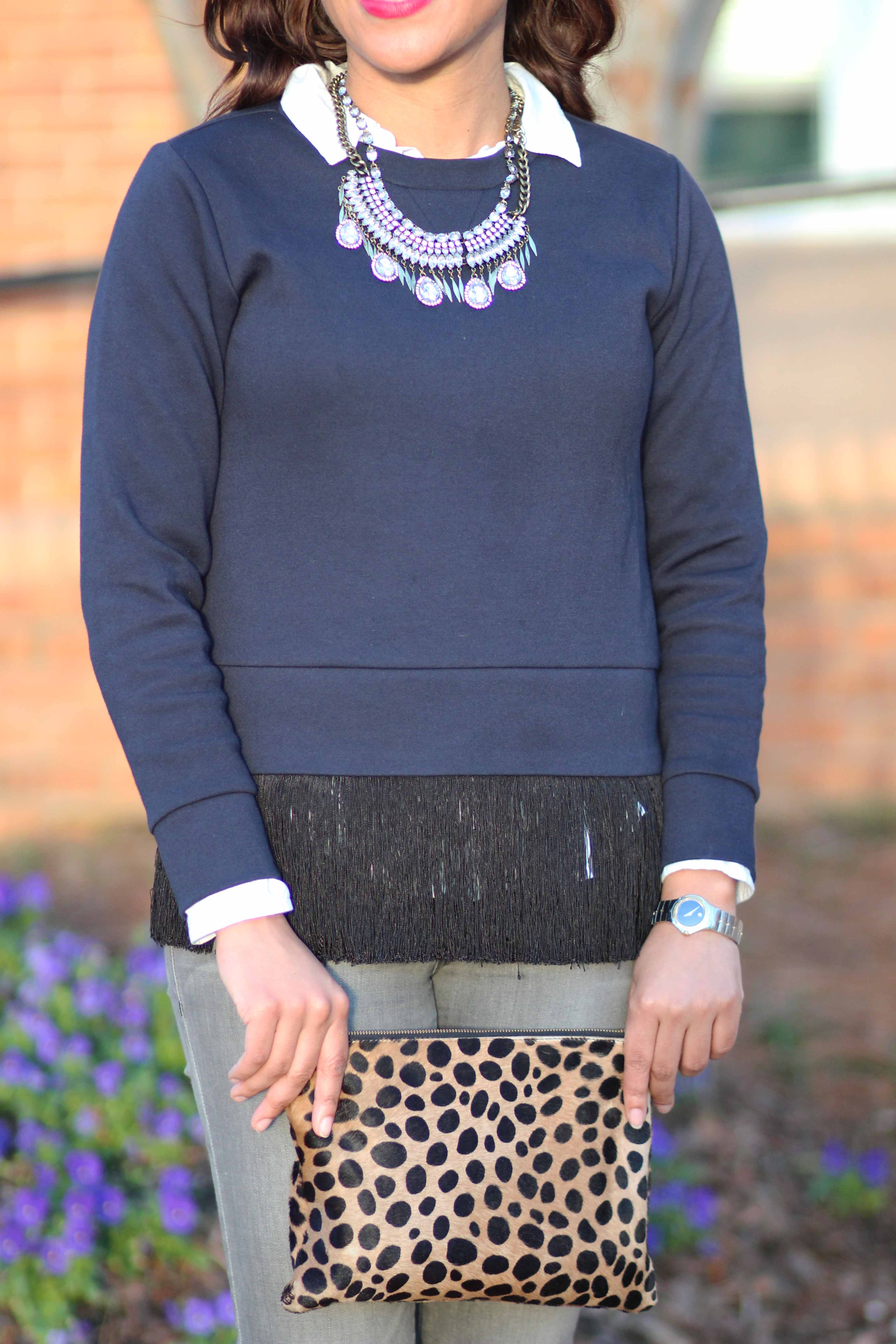 I hope your week is going well!  I wanted this J.Crew Fringe sweatshirt every since I first saw it on J. Crew’s website (They have had some really cute items recently?!), but didn’t know how much I would wear it.  Yes, I’m very into black and navy right now, but since it was so warm here (until this week…), that I wasn’t convinced winter was coming.  Let’s just say I knew it was meant to be when I found it on serious sale (check your stores where it was 50+% off around Christmas) on Christmas Eve.  I was only at the mall on Christmas Eve because that is when my dad decided to start his Christmas shopping (let’s just say he will be getting a lot more reminders next year!), but it all worked out as we completed all of his shopping in 3 hours (and I managed to get a great deal on this top for myself).
