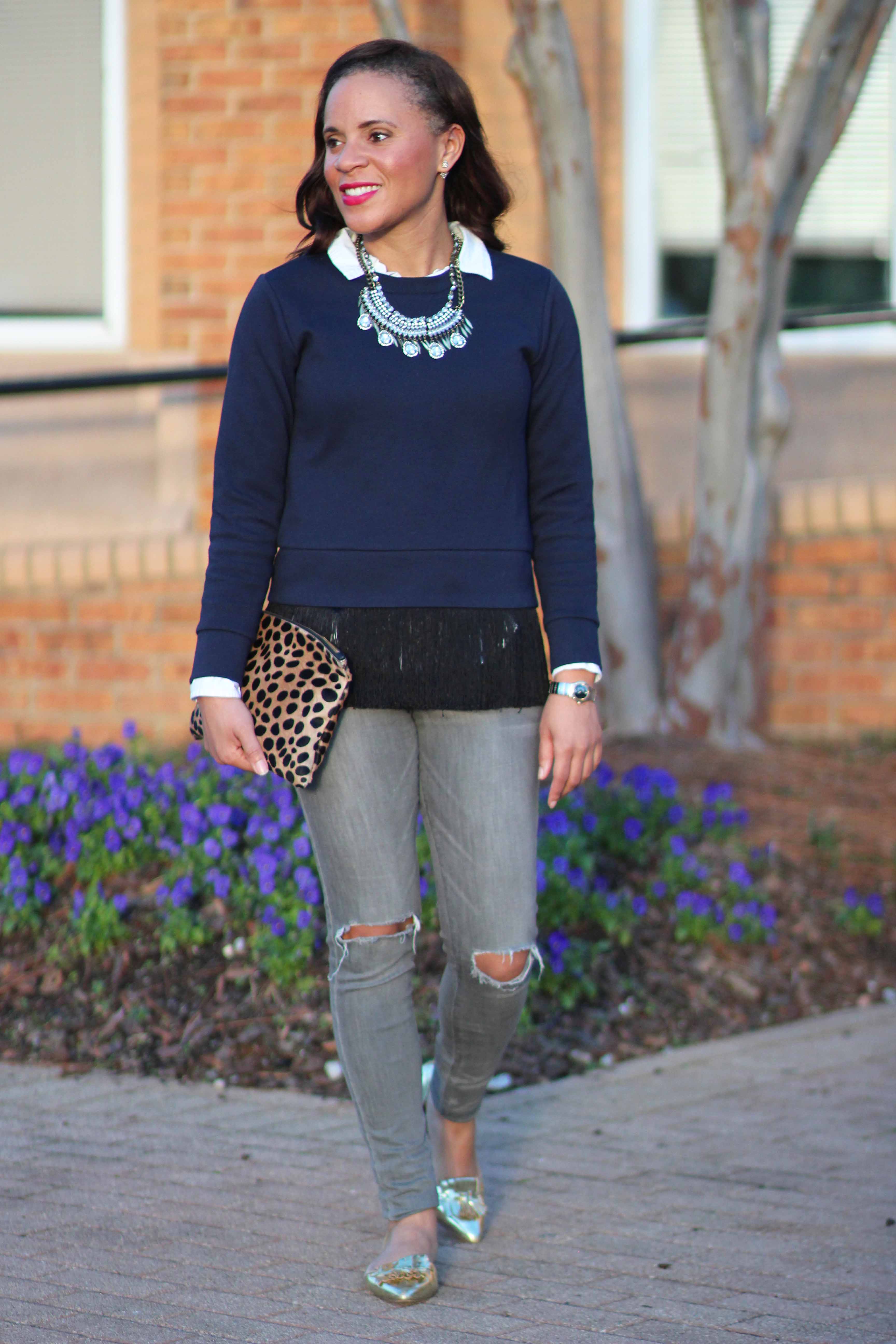 Sweater: J. Crew / Shirt: Target, similar / Jeans: Flying Monkey c/o Fab’rik, similar / Shoes: J. Crew, similar, similar / Necklace: Bauble Bar / Clutch: Clare V.