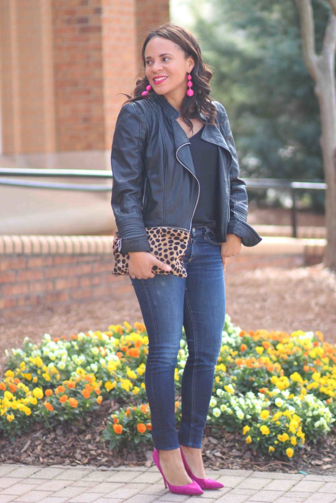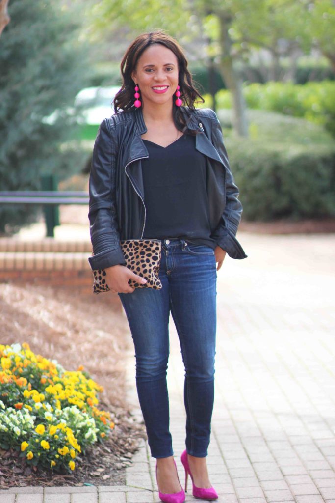 Jacket: Zara, similar / Top: Express / Jeans: Rag & Bone / Shoes: Jean – Michal Cazabat, similar less expensive option / Clutch: Clare V. / Earrings: Bauble Bar (love them, considering getting another color!)