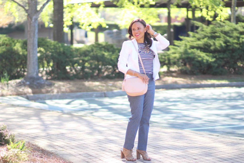 Jacket: Custom, similar / Top: J.Crew / Pants: J.Crew / Shoes: Sam Edelman (on sale!) / Bag: Old Navy / Necklace: Bauble Bar