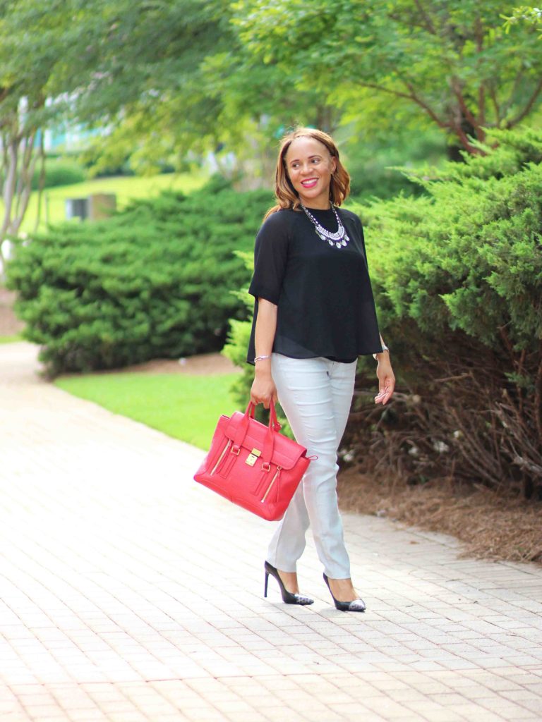 Love your bag! Like that it’s red, the color really complements the black and white outfit really well.