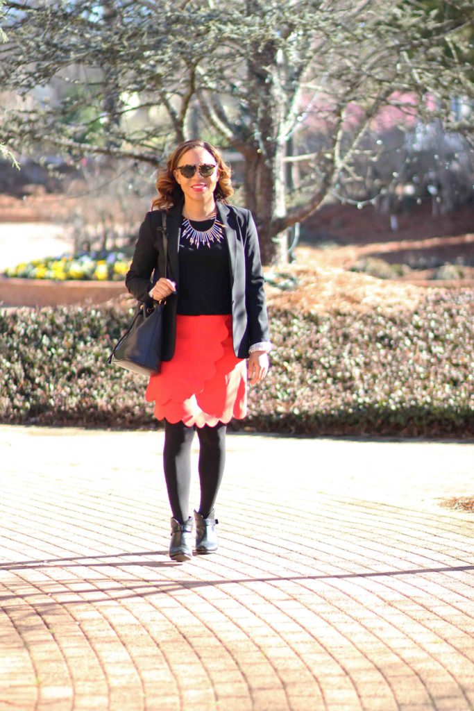 I couldn’t wait until spring to wear this skirt, so I paired it with tights and a black sweater. This skirt will also look great with a white top or denim top and sandals during the spring and summer.