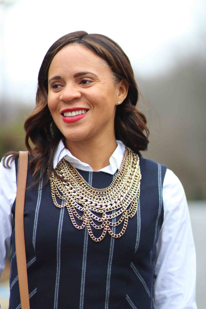 Anyway, enough rambling. I’m sharing another work outfit today. I found this pinstripe Derek Lam dress on major sale after Christmas but couldn’t quite figure out how to style it. It is a sleeveless dress and none of my jackets looked good with it since it has a flounce hem. I finally had an aha! moment when I decided to put something under it, instead of over it. Layering a shirt under a sleeveless dress is one of my favorite tricks to take a dress from summer to winter or just to make an outfit more interesting. Just make sure whatever you layer underneath is slim fitting and fairly thin. I don’t know about you, but I never want to add extra bulk!