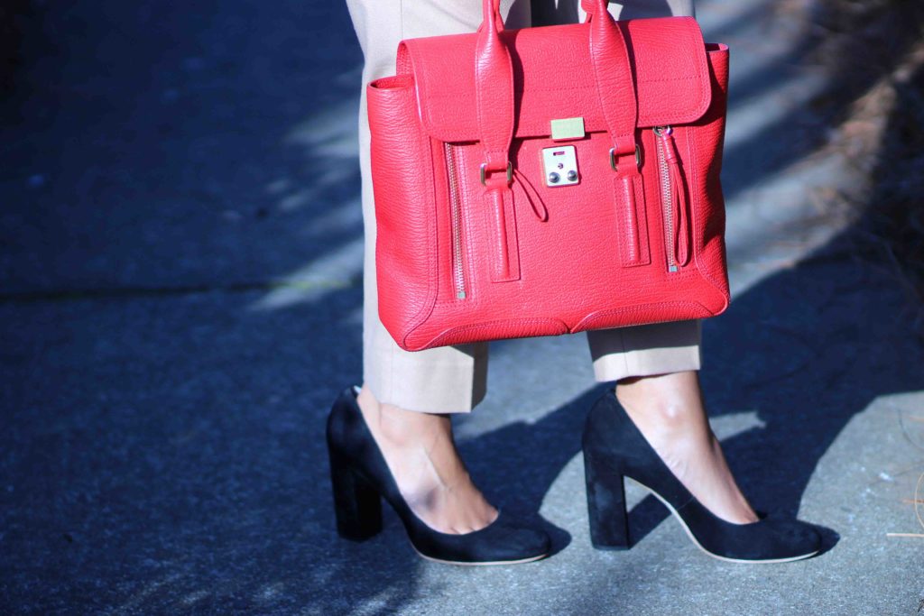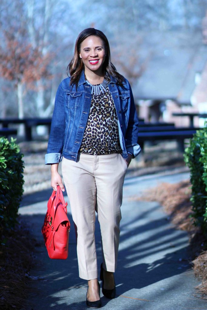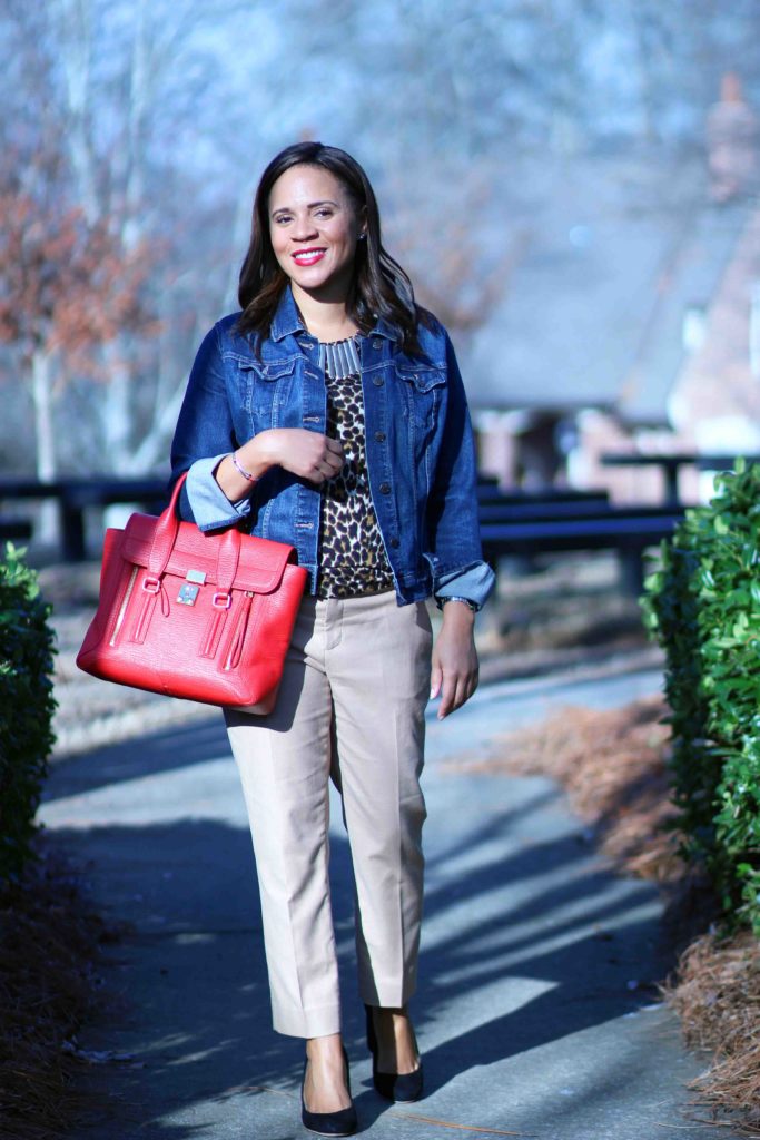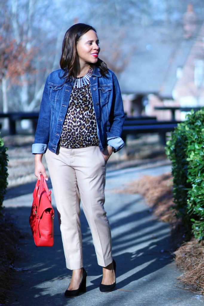 Jacket: Old Navy / Top: J. Crew, sold out, factory version / Pants: Banana Republic, similar / Necklace: Bauble Bar / Shoes: Loeffler Randall, on sale in another color / Purse: 3.1 Phillip Lim