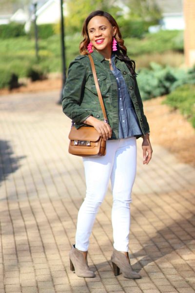 Top: Old Navy / Jeans: J. Crew, similar / Booties: Boutique find, similar / Jacket: Loft, similar / Bag: Old Navy, similar / Earrings: Bauble Bar, similar