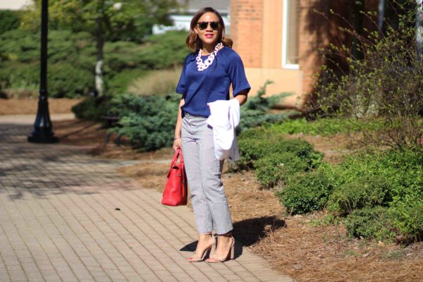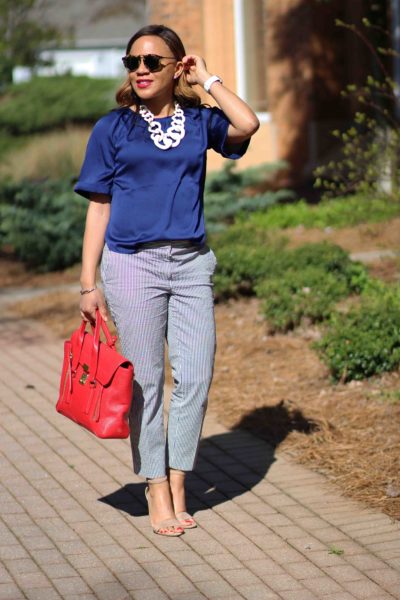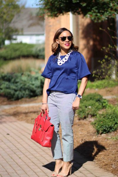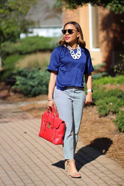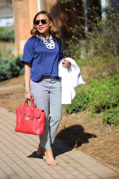 Top: Banana Republic / Pants: Ann Taylor, identical / Sandals: Sam Edelman / Necklace: Bauble Bar, identical / Bag: 3.1 Phillip Lim, love this less expensive option
